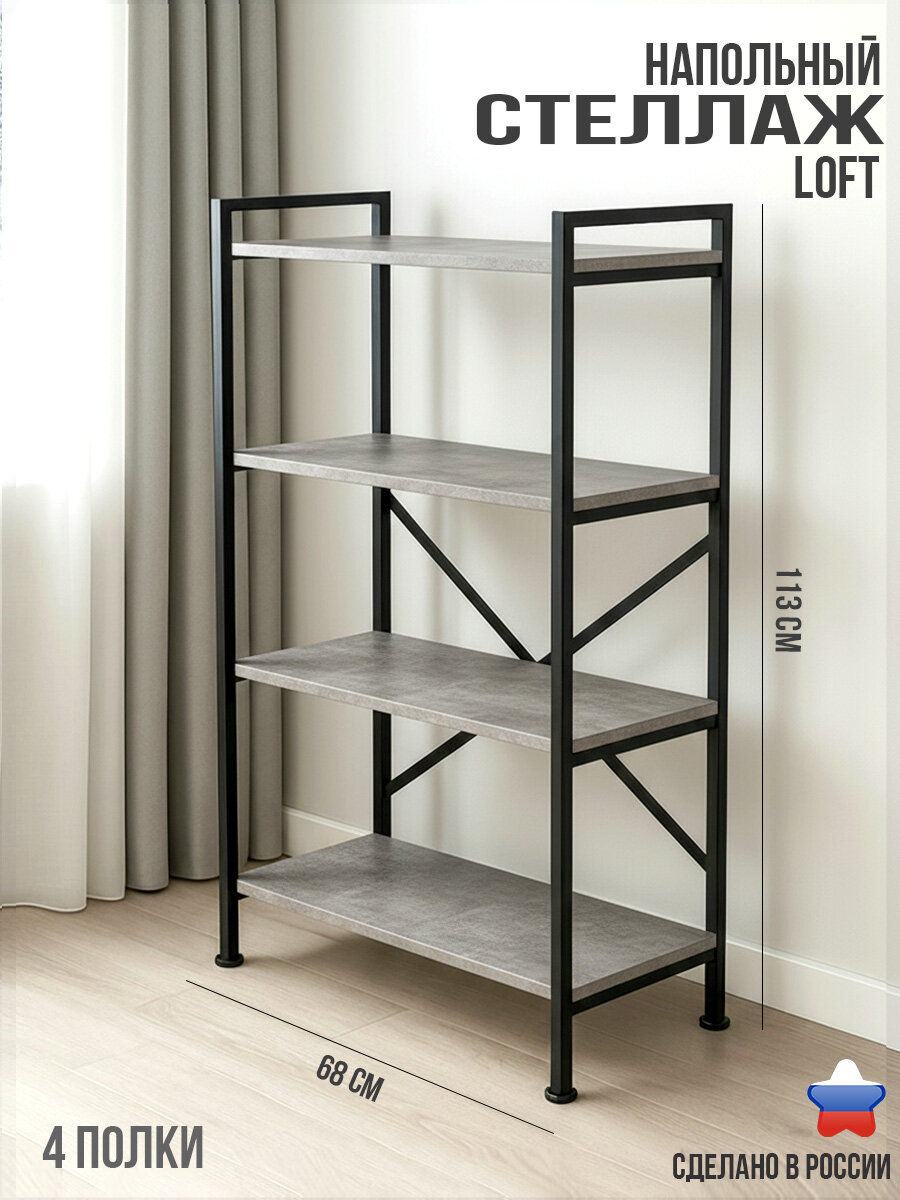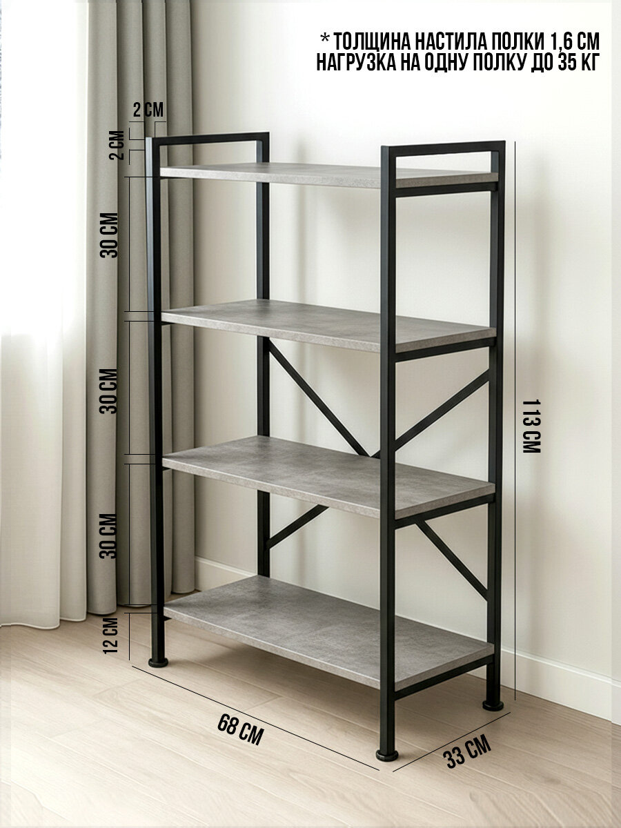 Открытый напольный стеллаж с деревянными полками, выполненными из ламинированного ДСП серого цвета с текстурой «Цемент», отличается высокой надежностью благодаря черному матовому каркасу, изготовленному из усиленного металлического профиля 20x20 мм, что делает изделие прочным и практичным. Благодаря высокой надежности и устойчивости металлокаркаса, каждая полка выдержит нагрузку до 35 кг. Четыре яруса выдержат общий вес до 140 кг.