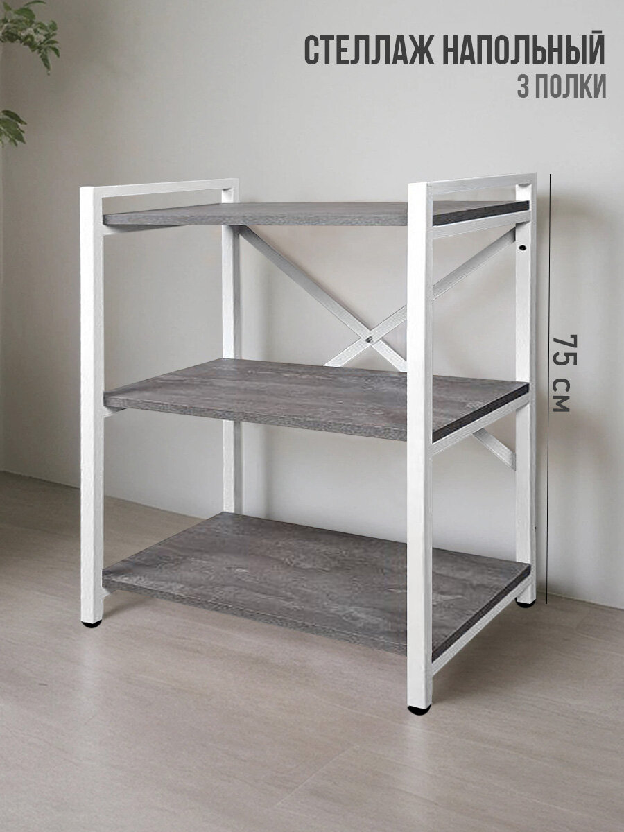 Открытый напольный стеллаж с деревянными полками, выполненными из ламинированного ДСП серого цвета с текстурой «Камень железный», отличается высокой надежностью благодаря белому глянцевому каркасу, изготовленному из усиленного металлического профиля 20x20 мм, что делает изделие прочным и практичным. Благодаря высокой надежности и устойчивости металлокаркаса, каждая полка выдержит нагрузку до 35 кг. Три яруса выдержат общий вес до 105 кг.