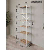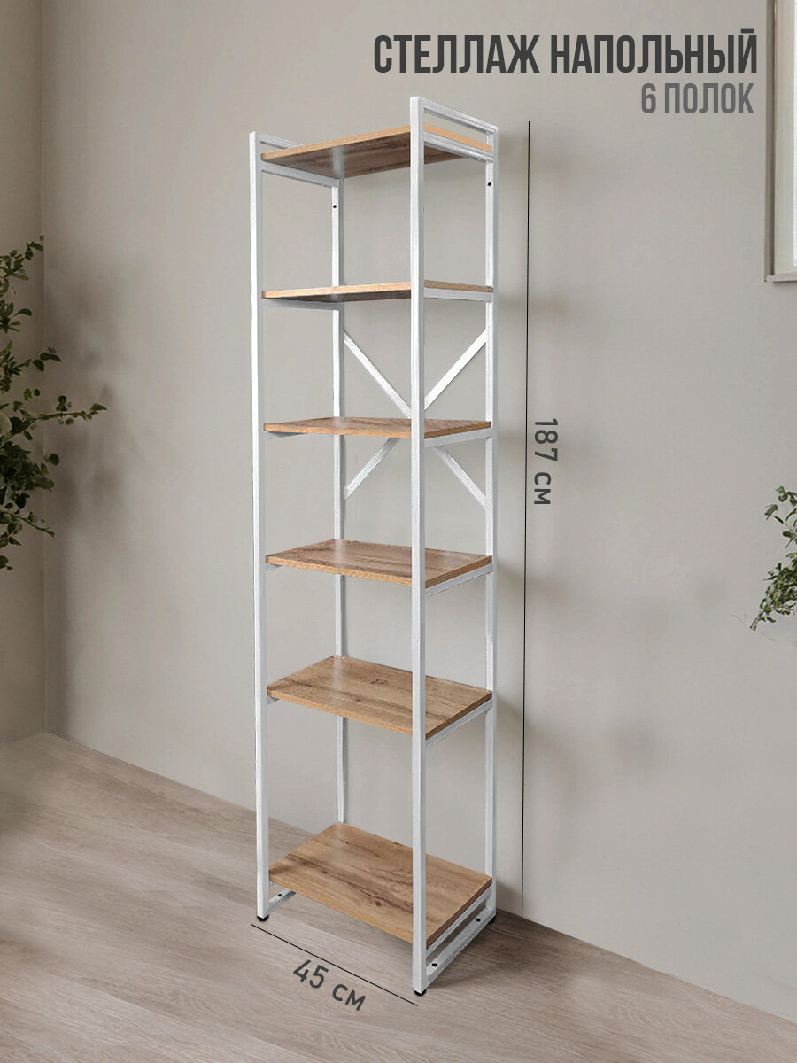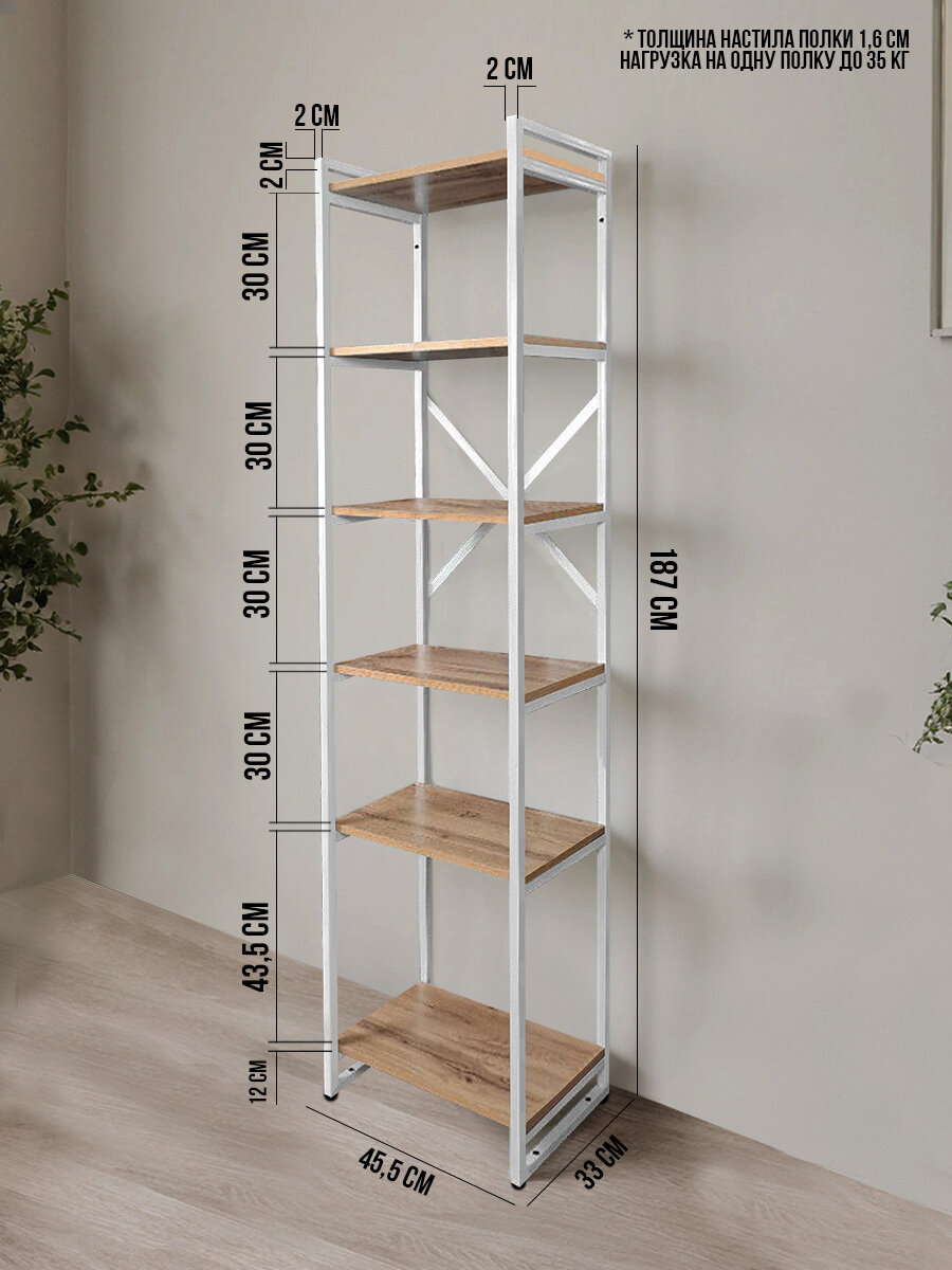 Стеллаж напольный с открытыми полками из ЛДСП (цвет дерева: дуб Вотан) обладает повышенной прочностью - ее белый глянцевый каркас выполнен из металлического профиля 20х20 мм, что делает изделие крепким и практичным. Благодаря своей высокой надежности и устойчивости каждая полка выдержит нагрузку до 35 кг. Можно безопасно класть книги. Оптимальная высота в 188 см удобна для использования.