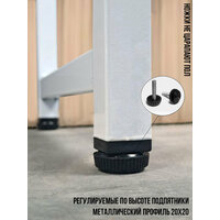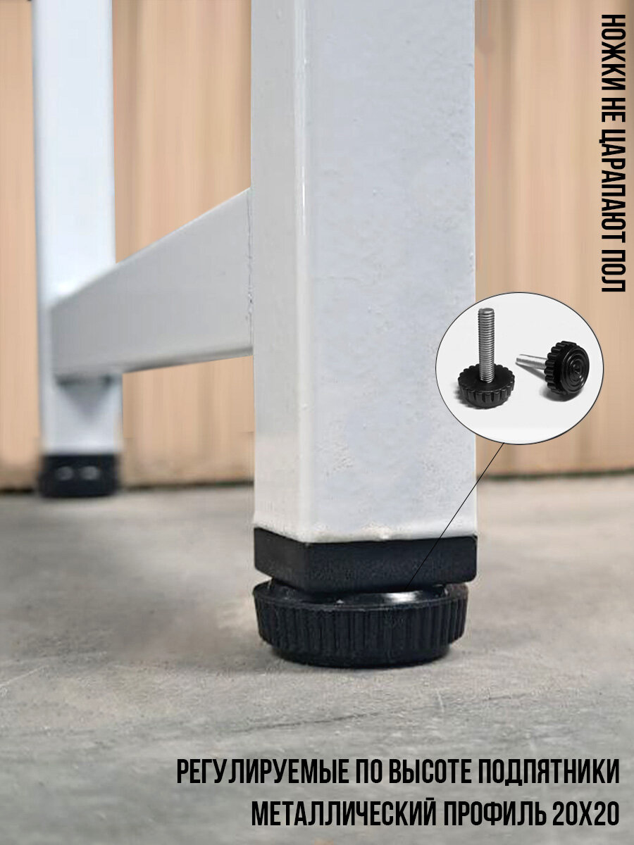 Железные ножки стеллажной системы защищены заглушками для предотвращения царапин на полу. Доставляется в коробке, потребуется дополнительная сборка, всё необходимое и инструкция для этого предоставлены в комплекте.