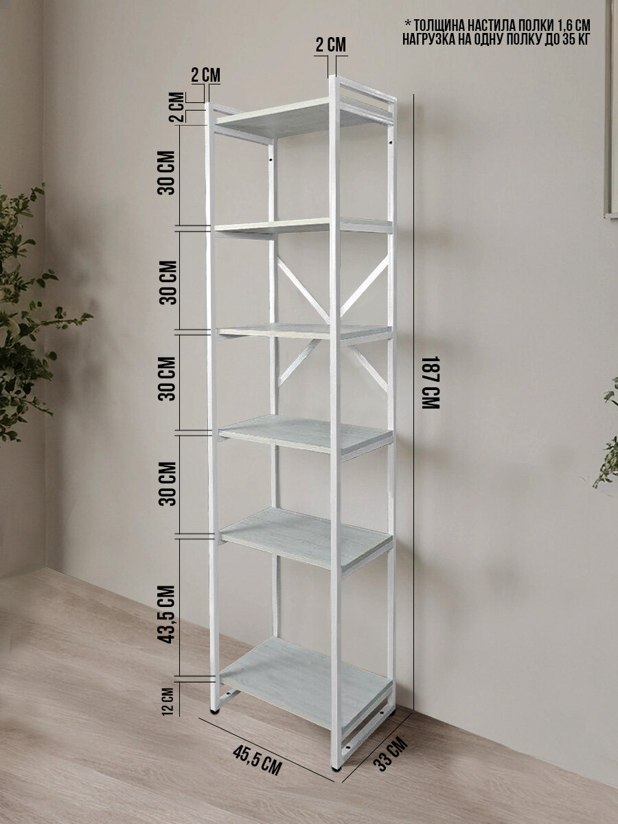 Компактный узкий мебельный стеллаж шириной 45,5 см и глубиной 33,5 см не занимает много места и впишется не только в маленьком коридоре или прихожей дома, но и подойдет зонирования комнаты как перегородка, прекрасно будет смотреться в интерьере гостиной, в гардеробной и магазине для вещей и одежды, кладовке для банок, в ванной, для детских игрушек, на кухне для хранения продуктов или посуды, балконе и лоджии, в гараже для инструментов. Современная интерьерная мебель в стиле лофт придаёт особый шарм в спальне, а универсальная расцветка позволит установить вертикальный стеллаж в кабинете офиса под офисные документы или принтер. Отличный вариант для дачи под рассаду, цветочная этажерка на пол для комнатных цветов и растений.