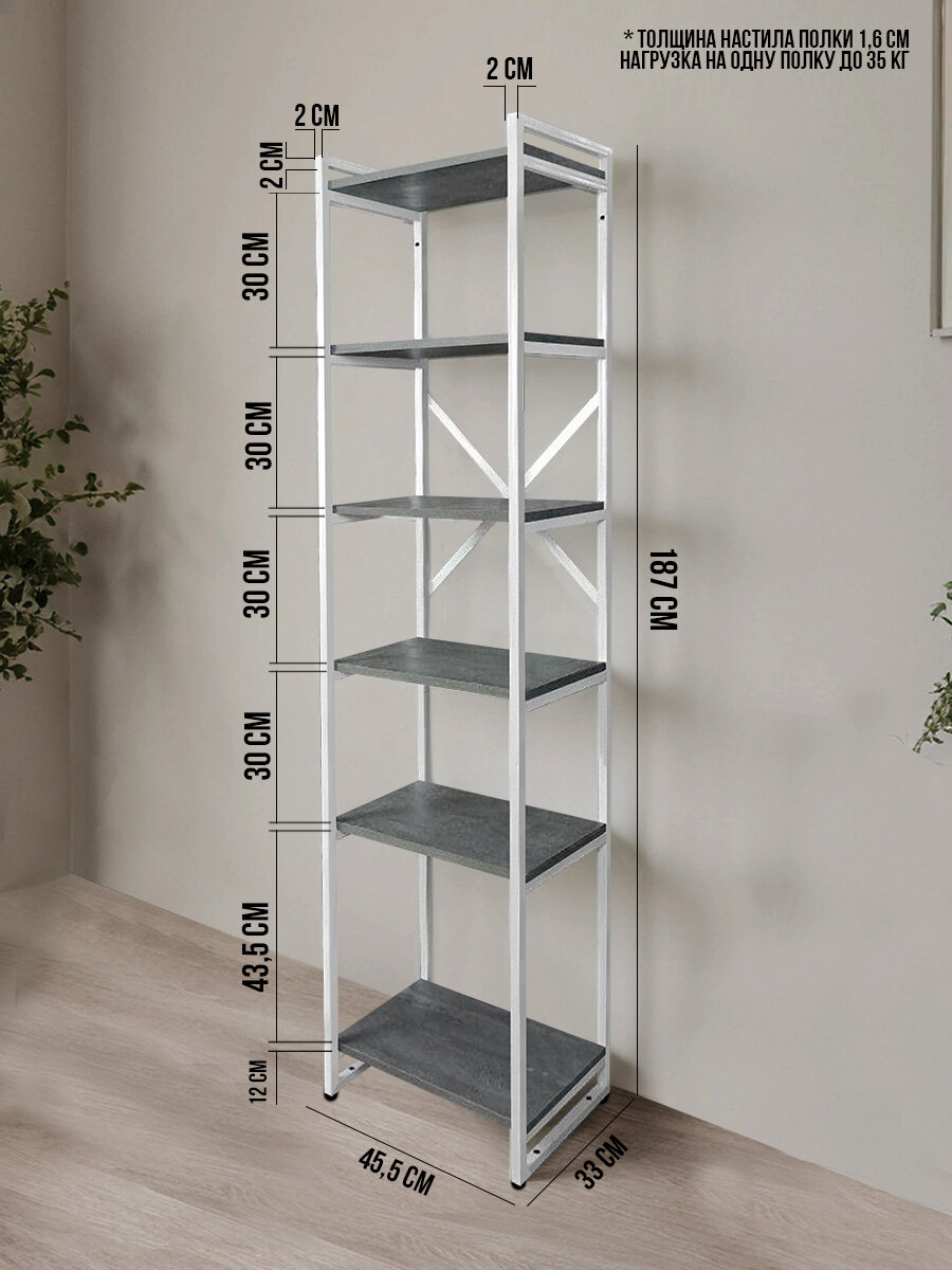 Компактный узкий мебельный мини стеллаж в 6 секций шириной 45,5 см и глубиной 33,5 см не занимает много места, прекрасно будет смотреться в маленьком коридоре или прихожей дома, в интерьере гостиной, в гардеробной для вещей, в торговом магазине для одежды, в кладовке для банок, в ванной и туалете, в комнате для детских игрушек или как книжный шкаф для школьных книг и учебников. Впишется на балконе и лоджии, в гараже для инструментов, прекрасная мебель на кухне для хранения кухонной посуды. Современная интерьерная мебель в стиле лофт придаёт особый шарм в спальне, а универсальная расцветка позволит установить вертикальный стеллаж loft в кабинете офиса под офисные документы в папках или установить на принтер. Отличный вариант для дачи под рассаду, цветочная этажерка на пол для комнатных цветов и растений.