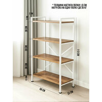 Открытый напольный стеллаж с деревянными полками, выполненными из ламинированного ДСП коричневого цвета с текстурой «Дуб вотан», отличается высокой надежностью благодаря белому глянцевому каркасу, изготовленному из усиленного металлического профиля 20x20 мм, что делает изделие прочным и практичным. Благодаря высокой надежности и устойчивости металлокаркаса, каждая полка выдержит нагрузку до 35 кг. Четыре яруса выдержат общий вес до 140 кг.