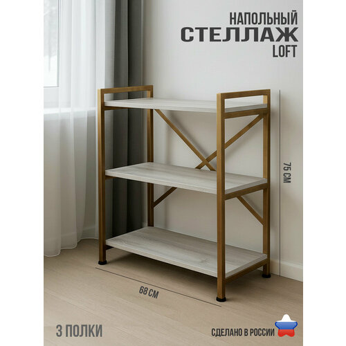 Открытый напольный стеллаж с деревянными полками, выполненными из ламинированного ДСП серого цвета с текстурой «Скандинавское дерево белое», отличается высокой надежностью благодаря золотистому матовому каркасу, изготовленному из усиленного металлического профиля 20x20 мм, что делает изделие прочным и практичным. Благодаря высокой надежности и устойчивости металлокаркаса, каждая полка выдержит нагрузку до 35 кг. Три яруса выдержат общий вес до 105 кг.