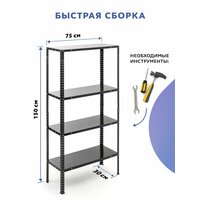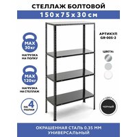 Стеллажи металлические болтовые Gastrorag GR-005-2 размером 150х75х30 см – это универсальная 4-ярусная система хранения различных предметов для гаража и сада, кладовой, кладовки и подсобки, балкона и лоджии, металлическая мебель в стиле лофт для квартиры, дома, дачи и офиса. Они также подойдут в качестве больших торговых или складских стеллажей для магазина. Стеллаж лофт можно использовать в качестве перегородки для зонирования пространства гостиной, спальни и гардеробной, металлического органайзера, напольной полки для хранения вещей, инструментов, домашних заготовок и консервации, подставки для обуви в прихожую, открытого шкафа для одежды, книг и игрушек, кухонного стеллажа для посуды или полки для микроволновки на кухню. В садоводстве он пригодится в качестве стеллажа под рассаду, этажерки для комнатных цветов и растений. Ему найдется применение и в качестве офисной мебели для хранения папок с документами. Железный окрашенный стеллаж поставляется в разобранном виде. Стеллаж трансформер укомплектован стойками высотой 150 см, которые состоят из двух частей. Вы можете собрать как один стеллаж высотой 150 см с 4 полками, так и 2 стеллажа высотой 75 см с 2 полками. Полки и стойки изготовлены из стали с порошково-полимерным покрытием, которое защищает от коррозии и позволяет использовать этажерку в помещениях с повышенной влажностью воздуха, например, в ванной комнате. Открытый напольный стеллаж легко собирается при помощи входящих в комплект болтов и гаек. Края полок острые, поэтому при сборке следует соблюдать осторожность и пользоваться хозяйственными перчатками. Завальцованные края металлических полок и стоек, а также восемь металлических уголков обеспечивают дополнительную жесткость конструкции и безопасность в эксплуатации. Пластиковые подпятники предохраняют пол от повреждений. Толщина металла составляет 0.35 мм. Этого достаточно, чтобы обеспечить допустимую максимальную нагрузку на полку - 30 кг, на весь стеллаж - 120 кг. Длина полочки 75 см, ширина 30 см. Высота полок регулируется с шагом 25 мм. В целях обеспечения устойчивости рекомендуется ставить стеллаж вплотную к стене и дополнительно крепить его к стене.