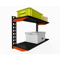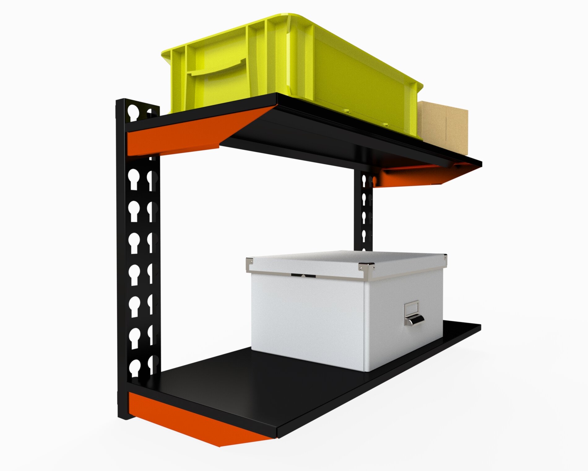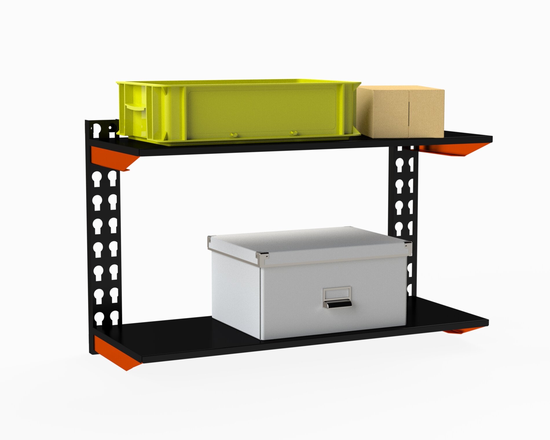 Настенный модульный стеллаж Metalex серии FLY 500х900х200 (2-е полки), используется для хранения вещей и документов в офисах, на производстве, на складах, в магазинах, в доме, на балконах, на дачах и других помещениях. Распределенная нагрузка на полку до 30 кг, распределенная нагрузка на стеллаж до 60 кг. Данный стеллаж поставляется с металлическими полками толщиной 0,8 мм, которые имеют дополнительные ребра жесткости. Стойки и кронштейны выполнены из 1,5 миллиметровой стали. Безболтовое соединение обеспечит легкую и быструю сборку. Полки можно выставлять на любом удобном для Вас уровне. В комплект входит набор креплений к стене, крепление кронштейнов происходит с помощью зацепов. Цвет: Оранжево-чёрный