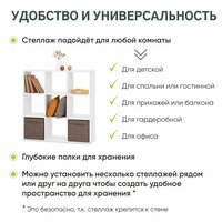Напольный модульный стеллаж имеет устойчивую конструкцию. В комплектацию входит металлический уголок для крепления к стене, что исключает падение стеллажа. Благодаря креплениям к стене стеллаж при максимальной нагрузке не упадет. Дюбель или саморез для крепления приобретается самостоятельно в зависимости от материала стены, к которой будет крепиться шкаф.