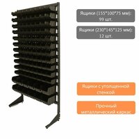 Наполнение стеллажа: Ящики (90*100*50 мм): 0 шт. Ящики (155*100*75 мм): 99 шт. Ящики (230*145*125 мм): 12 шт. Всего ящиков: 111 шт. Металлический стеллаж с пластиковыми ящиками предназначен для хранения крепежа и мелких товаров. Стойка окрашена порошковой краской. Ящики изготовлены из полипропилена высокого качества. Надежность конструкции гарантируется. Стеллажи с ящиками идеально подойдут для магазина крепежа, склада или станут хорошим решением при размещении запчастей в гараже. Грузоподъемность – 800 кг. Стеллаж показывает высокое качество эксплуатации, даже при полной загрузке ящиков.