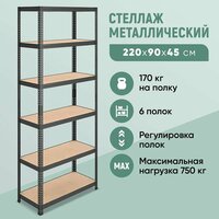 Стеллаж имеет шесть регулируемых по высоте ярусов, что позволяет оптимально использовать пространство и размещать предметы различных размеров. Максимальная нагрузка на ярус составляет 170 кг, а на весь стеллаж - до 750 кг.
