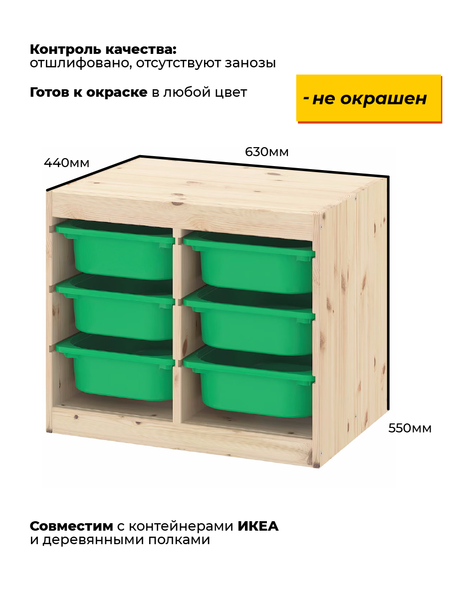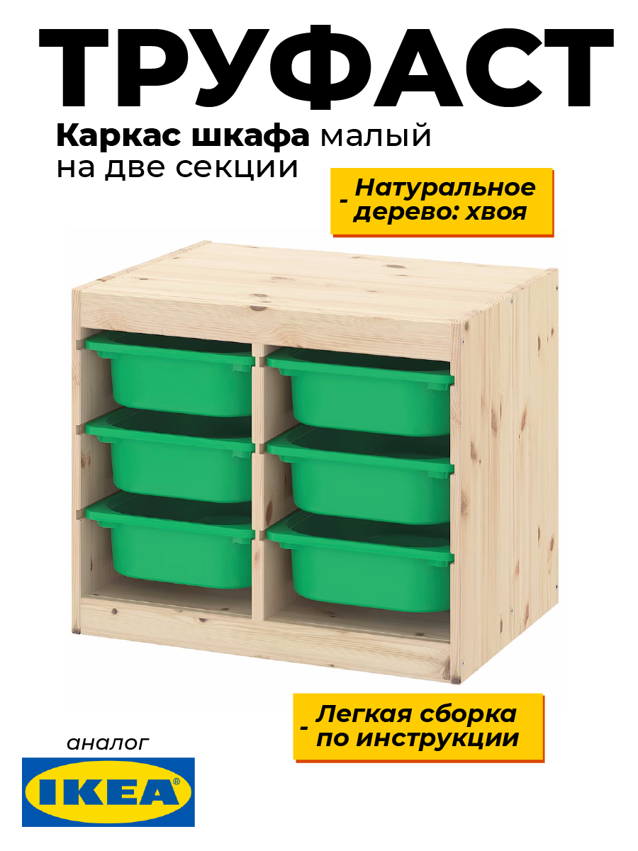 Малый стеллаж Труфаст на две секции – идеальное решение для вашего дома! Этот двойной шкаф прекрасно подойдет для хранения большого количества вещей, благодаря своему современному дизайну и функциональности. Особенности вертикального стеллажа Труфаст: – Современный и стильный дизайн, который впишется в любой интерьер; – Вместительность и удобство: два отделения позволяют хранить множество вещей от одежды до спортинвентаря; – Функциональность – возможно дополнить полками или пластиковыми контейнерами. – Прочность и надежность: высококачественные материалы обеспечивают долговечность и прочность шкафа; – Легкость сборки своими силами – благодаря подробной и понятной инструкции; – Экономия места – компактные размеры и функциональность делают его идеальным выбором для небольших пространств; – Экологичность – при производстве используются только безопасные для здоровья и экологии материалы. Габариты шкафа: 63 см в длину, 44 см в глубину и 55 см в высоту. Изготовлен из массива дерева. Рекомендуем покрыть лаком, краской или воском для долгой службы изделия во избежание пересыхания древесины и ее деформации.