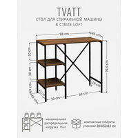 Универсальный стеллаж TVATT loft для стиральной машины - настоящий органайзер для всех ваших вещей и аксессуаров. Стильный и компактный, он идеально впишется в любую ванную комнату, придавая ей порядок и уют. Достоинство данного стеллажа в стиле лофт - удобное хранение различных предметов. Вы можете использовать его как тумбочку, на которой будут размещены косметика и принадлежности для ухода за собой. А благодаря высоким полкам на них смогут разместиться все вещи, необходимые для ежедневной жизни, декоративные корзинки, коллекция ароматических свечей, полотенец и даже есть место для массажной ванночки для ног или тазика. Используйте шкаф пенал, как полку для посуды, моющих средств или стойка для цветов, этот стеллаж органично впишется в интерьер вашей гостиной или кухни. Его модульный дизайн позволяет создавать оригинальные композиции из нескольких шкафчиков и полок нашего производства UNA LOFT и UNA LOFT mini. Прочная разборная конструкция и качественные материалы гарантируют надежность и долговечность этажерки. Каждая полка стеллажа может выдерживать нагрузку от 15 до 20 кг, что позволяет разместить на ней все необходимые предметы без беспокойства о прочности. Стеллаж металлический оснащен регулируемыми опорами на ножках, которые обеспечивают устойчивость и защищают пол от царапин и вмятин. Вы можете легко подстроить его под любую поверхность для оптимального использования пространства. Металлический каркас у органайзера с полками выполнен из профиля 20 х 20 мм, окрашен в черный матовый цвет и защищен от ржавчины и коррозии благодаря порошковому покрытию, устойчивому к влаге. Полки изготовлены из высококачественного ЛДСП толщиной 16 мм. Столешница изготовлена из высококачественного ЛДСП, специальное ламинированное покрытие делает ее ударопрочной и не царапающейся, а также защищает от влаги. Стеллаж модульный напольный изготовлен из цельносварного металлического каркаса, усилен двумя задними металлическими балками, что позволяет ему сохранять устойчивое положение. Поставляется стеллаж деревянный в 1 упаковке, конструкция разборная, легко собирается с помощью шуруповерта и болтов, крепления и подробная инструкция по сборке входят в комплектацию. Независимо от того, где вы решите разместить этот узкий стеллаж - он прекрасно сочетается с любыми интерьерами благодаря своему стильному и элегантному дизайну. Товар продается напрямую от производителя, что гарантирует качество и выгодную цену.