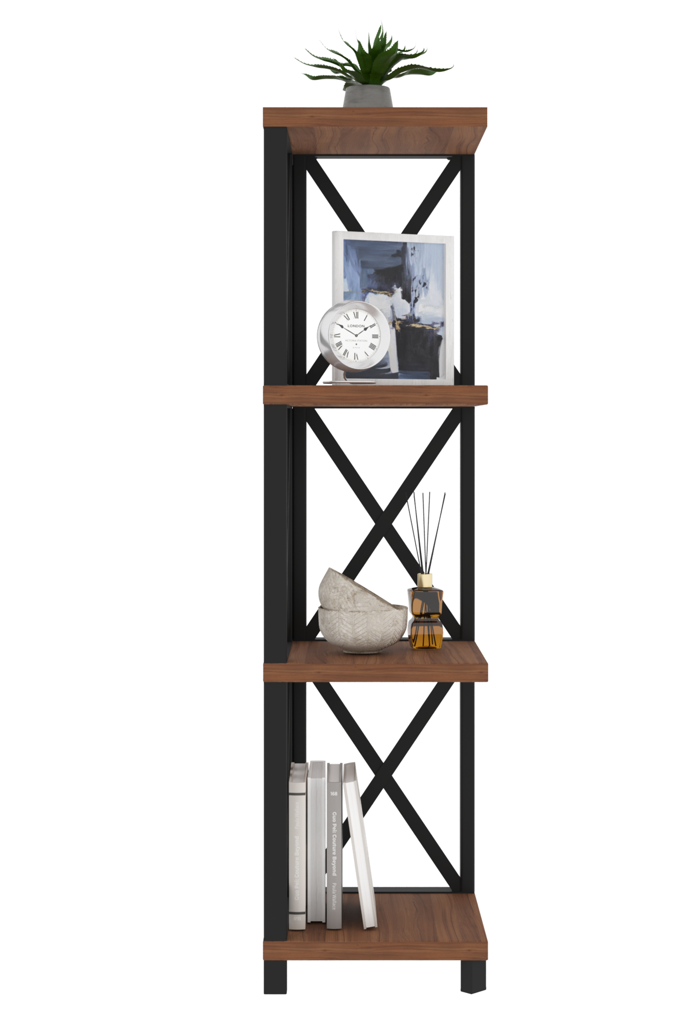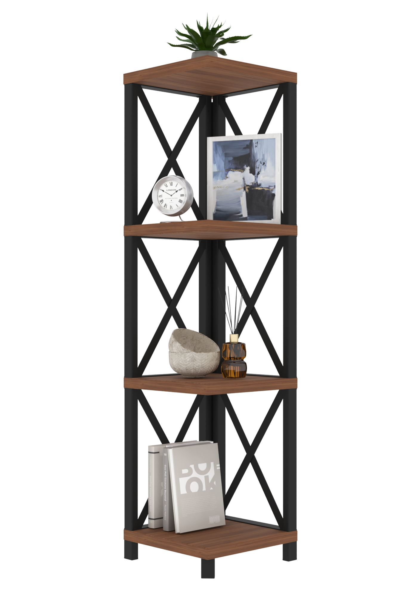 Небольшой легкий угловой стеллаж на металлическом каркасе. Размер 29х29х115 см. Внимание: ЛДСП 25 мм! ЛДСП премиум класса от фирмы Эггер, цвет Орех Дижон натуральный. Порошковая покраска, фактура муар. Возможно использование в ванной. Не допускайте прямого попадания воды.