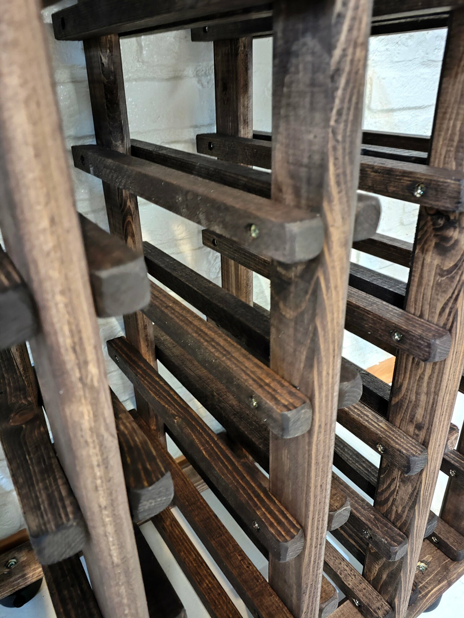 Вместимость стеллажа составляет 24 места, что позволяет разместить весь ваш запас вина или шампанского. Поверхность стеллажа покрыта пропиткой из льняного масла темно-коричневого оттенка, что придает ему элегантный вид и защищает от внешних воздействий.