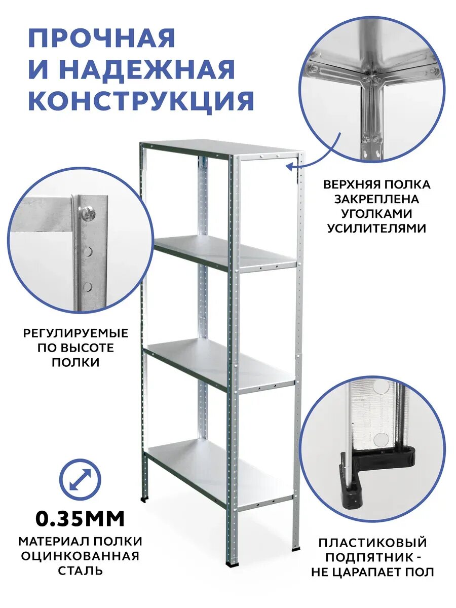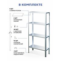 Полочки и стойки изготовлены из полированной оцинкованной стали, которая не подвержена коррозии и может быть использована в помещениях с повышенной влажностью воздуха, например, в ванной комнате. Открытые напольные шкафы 4 яруса легко собираются при помощи входящих в комплект болтов и гаек.