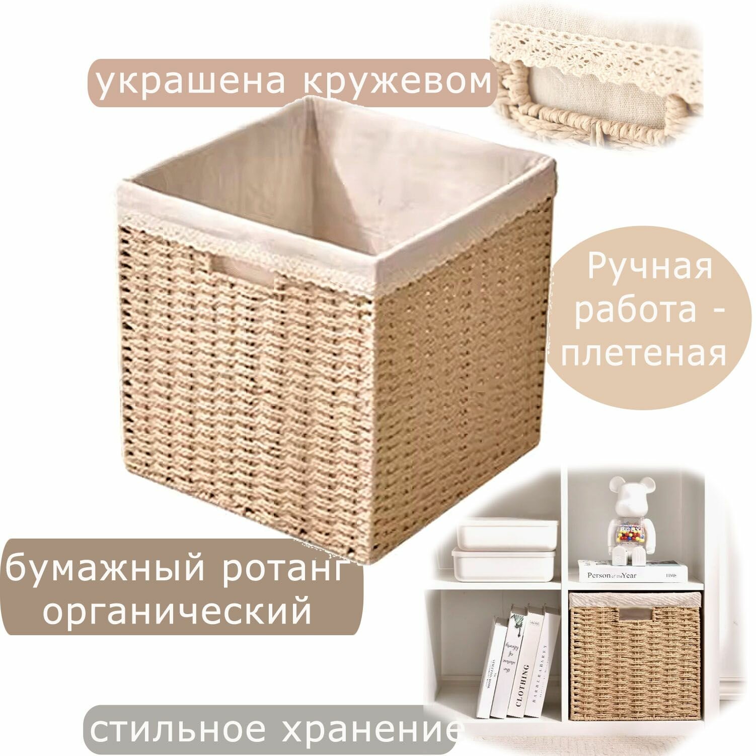 Стеллажная корзина с кружевом / коробка для хранения вещей как икеа тьиллевипс TJILLEVIPS 32х32х32 см, складная, ручная работа из плетеной бумажной веревки с защитной тканью