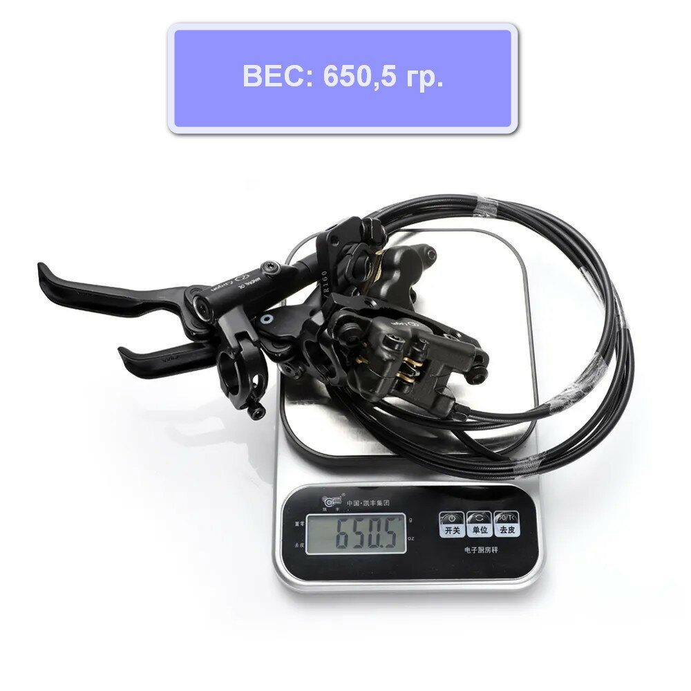 Полный комплект дисковых гидравлических тормозов Logan HD-M220, включающий в себя ручки с тормозными калиперами для переднего и заднего колеса, а также два тормозных ротора диаметром 160 мм и крепежные элементы. Тормозные ручки имеют крепление под рулевую трубу диаметром 22,2 мм. Калиперы - двухпоршневые. Длина гидролинии (передний/задний): 820/1420 мм. Вес комплекта без роторов: 650,5 грамм. Цвет: черный.