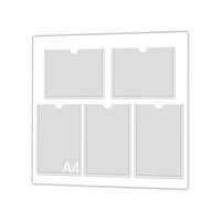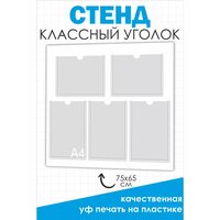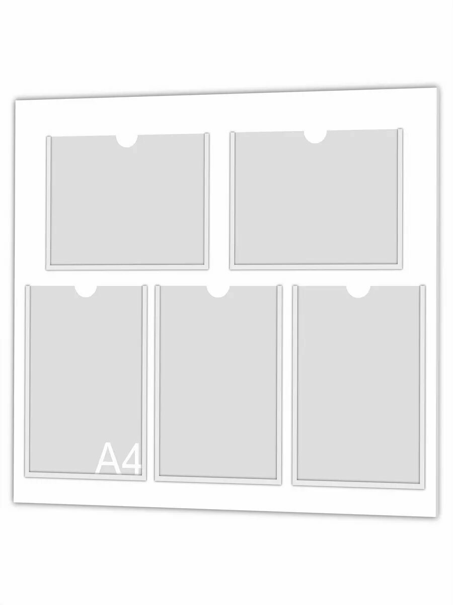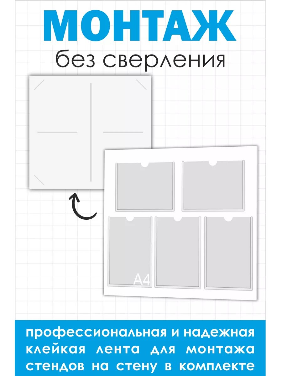Универсальный информационный стенд на 5 карманов А4 — идеальное решение для школы, детского сада и офиса! Качественный современный дизайн и отсутствие надписей позволяет самостоятельно выбирать и изменять информацию, делая стенд максимально адаптируемым под конкретные нужды. Оптимальное количество карманов обеспечивают достаточное пространство для размещения разнообразных материалов и постоянного обновления информации. Школьный стенд имеет размер: 750 х 650 мм. Материал конструкции стенда для школы: ПВХ пластик белый - прямая УФ печать. Материал карманов: ПЭТ 0,5 мм прозрачный. Уголок для класса устойчив к влаге (при необходимости можно мыть). В комплекте идет двусторонний скотч для монтажа стенда к стене (не требуется просверливать отверстия для монтажа).