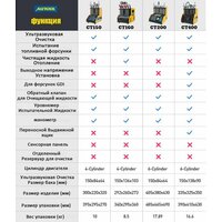 - Широкий спектр применения CT160 Автомобильный топливный инжектор Тестер и очиститель нагрева имеют хорошую совместимость. Поддержка большего количества автомобилей и мотоциклов для «очистки» и «тестирования» топливной форсунки. А также может использоваться для «очистки» дизельных топливных форсунок.