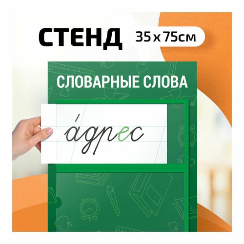 Стенд для школьного класса «Словарные слова». Размер стенда 35х75 см, на нём расположены 4 кармана под карточки. Размер карманов 30х14 см. Основа стенда - пластик ПВХ 3 мм, изображение напечатано на плёнке, что позволяет протирать его влажной салфеткой при необходимости. Для сохранности стенд перед отправкой упаковывается в картонную обертку. Прикрепить стенд вы можете любым удобным для вас способом: двухсторонним скотчем, саморезами и т. п. (крепления в комплект не входят)