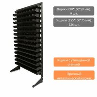 Наполнение стеллажа: Ящики (90*100*50 мм): 9 шт. Ящики (155*100*75 мм): 126 шт. Ящики (230*145*125 мм): 0 шт. Всего ящиков: 135 шт. Металлический стеллаж с пластиковыми ящиками предназначен для хранения крепежа и мелких товаров. Стойка окрашена порошковой краской. Ящики изготовлены из полипропилена высокого качества. Надежность конструкции гарантируется. Стеллажи с ящиками идеально подойдут для магазина крепежа, склада или станут хорошим решением при размещении запчастей в гараже. Грузоподъемность – 800 кг. Стеллаж показывает высокое качество эксплуатации, даже при полной загрузке ящиков.