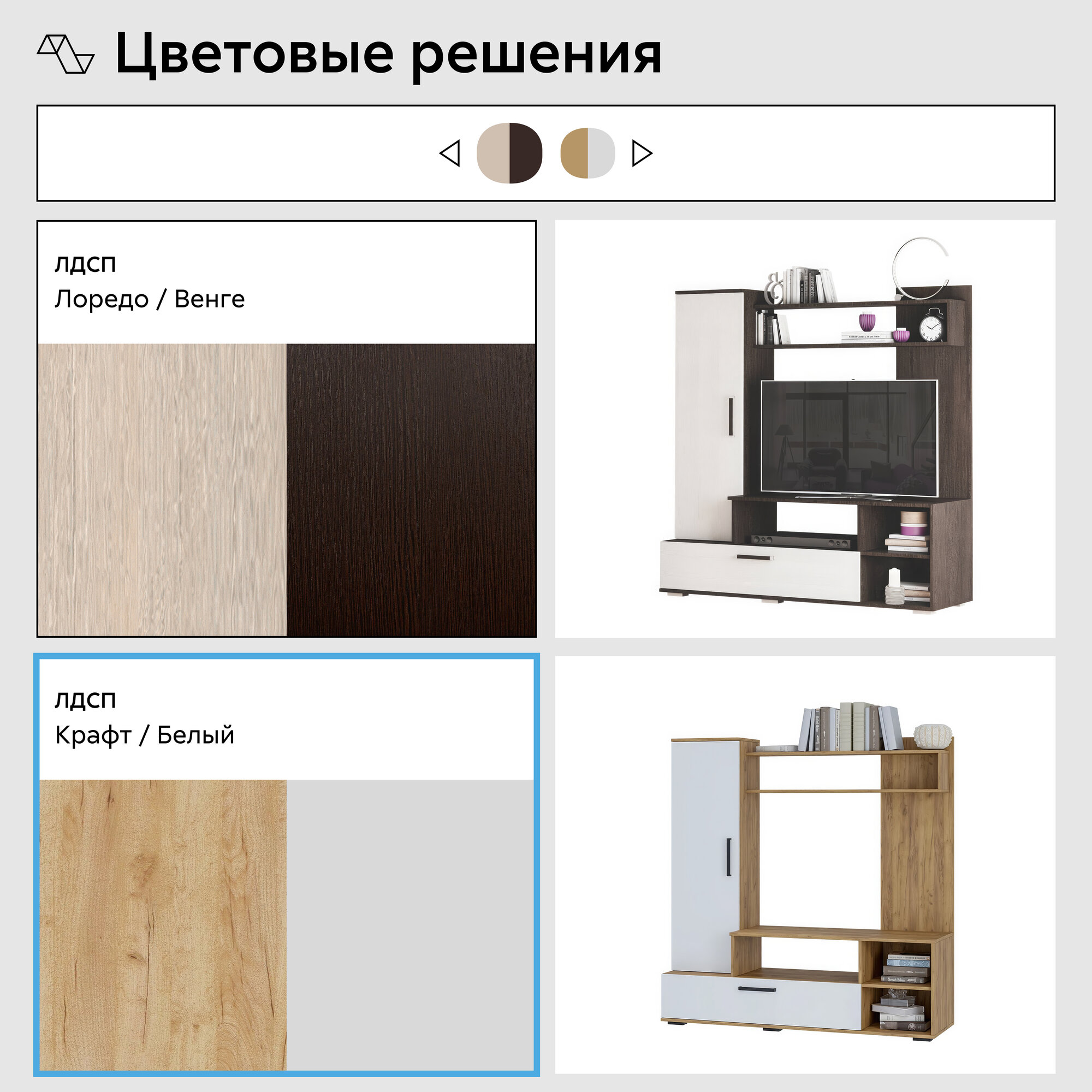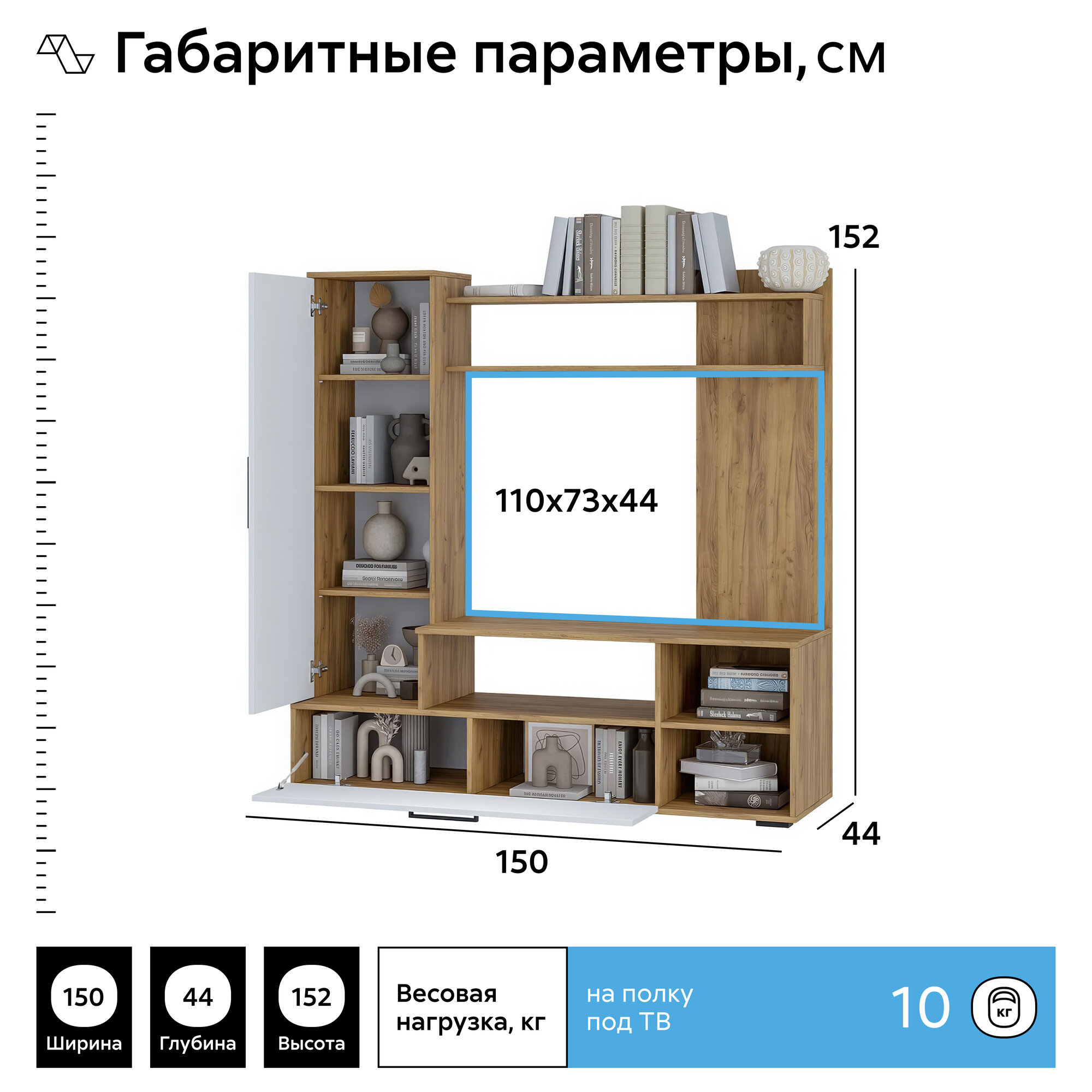 Цвет: Коричневый, Белый Ширина: 150 см Глубина: 44 см Высота: 152 см В комплект входит: Дополнительно: Максимальная нагрузка на полку под ТВ - 10 кг. Максимальная нагрузка на полки пенала - 6 кг.