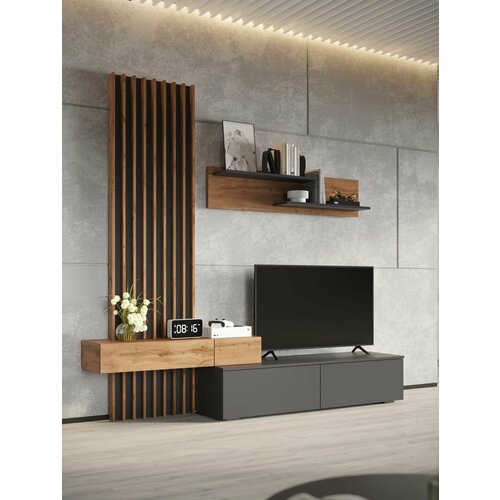 Интерьерная стенка Риана — это сочетание современного дизайна и природной теплоты для создания организованного пространства. Фактура натурального дерева, используемая в отделке, создает уютную атмосферу, которая наполняет дом комфортом и природной гармонией. Декоративная стеновая панель с вертикальными рейками МДФ – яркий акцентный элемент, добавляет структурированности и выразительности . Благодаря нейтральным цветам декора, стенка подойдет практически к любому интерьеру. Реальный цвет товара может незначительно отличаться от изображения на экране.