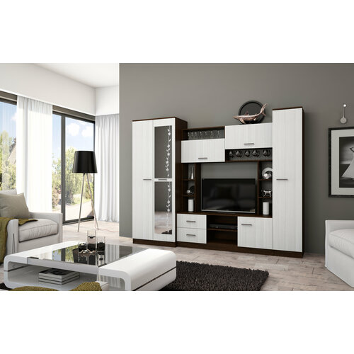 Гостиная Марта-11 прекрасно впишется в любой современный интерьер. По бокам ниша под телевизор оборудована полками для небольших предметов декора – это поможет создать теплую домашнюю атмосферу. Зеркальная вставка во весь рост визуально увеличивает помещение и добавляет света. Фрезеровка на стекле добавляет шарма в интерьер гостиной. Гостиная состоит из платяного шкафа со штангой, центральной части и пенала с полками. Конструкция стенки позволяет осуществлять разные варианты сборки. Размер стенки: 270х210х50см. Ниша для ТВ:1000х800 мм. Особенности стенки: Шкаф оснащён штангой для плечиков с одеждой и полкой. Средняя секция с нишей под ТВ размером 1000х800 мм с двумя выдвижными ящиками на роликовых направляющих и полочками. Пенал с полками шириной 397 мм. Зеркало 4 мм с рисунком (пескоструйная обработка).