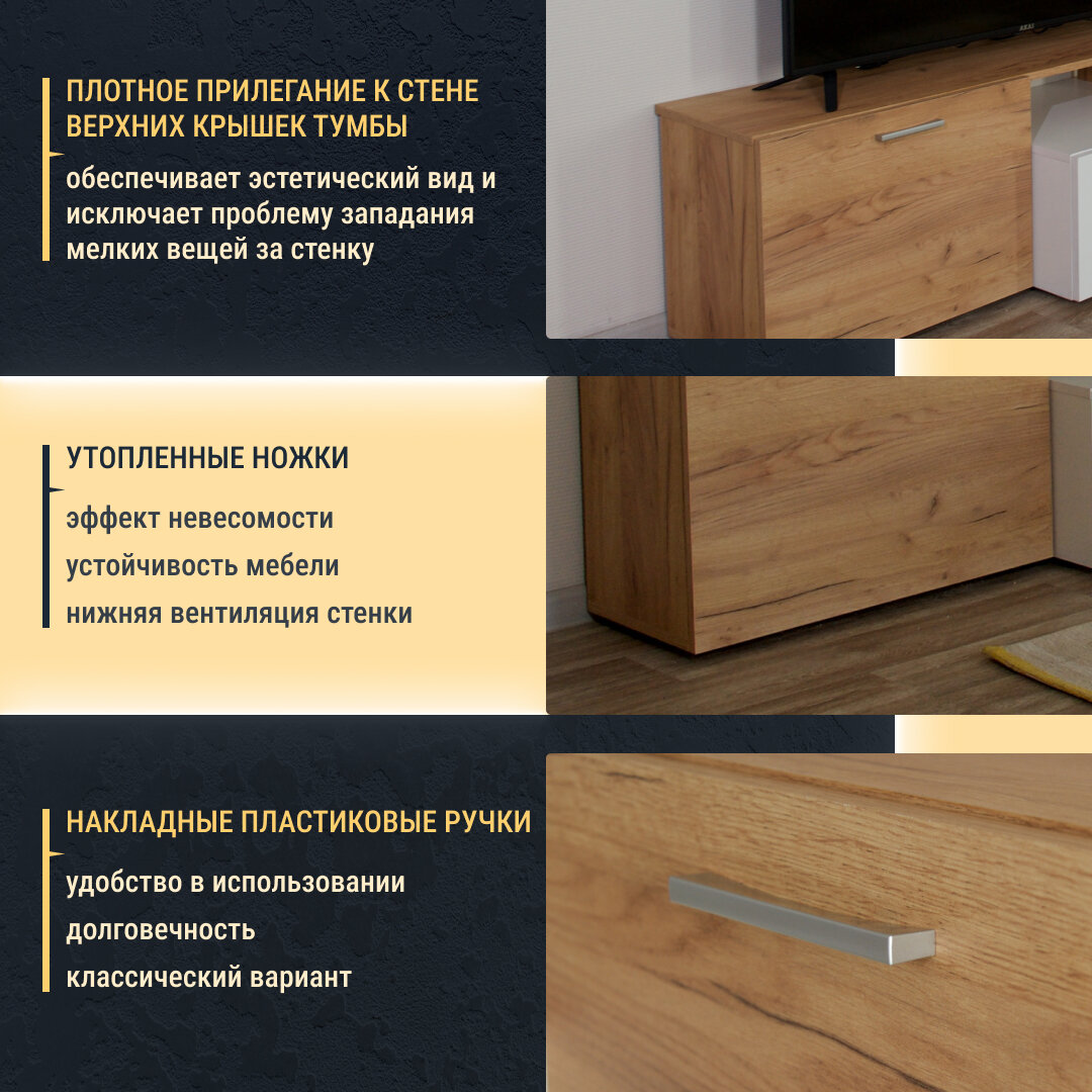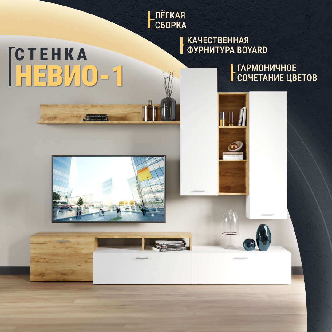 Стенка в гостиную со шкафом выполнена с учетом новейших дизайнерских решений в современном стиле - сочетание теплого оттенка дерева с четкой древесной текстурой и белого цвета, разноуровневые модули, скрытая крепежная фурнитура. Все эти элементы создают визуальную легкость и компактность модульной мини стенки. Мебель легко устанавливается и регулируется по высоте. Широкая тумба для ТВ позволит разместить телевизор любой диагонали, подвесные полки послужат для размещения других медиа устройств в гостиной и зале. Горку дополняет вместительный классический комод с ящиками полного выдвижения. Мебель выполнена из высококачественных экологичных материалов. Реальный светлый цвет товара может незначительно отличаться от изображения на экране.