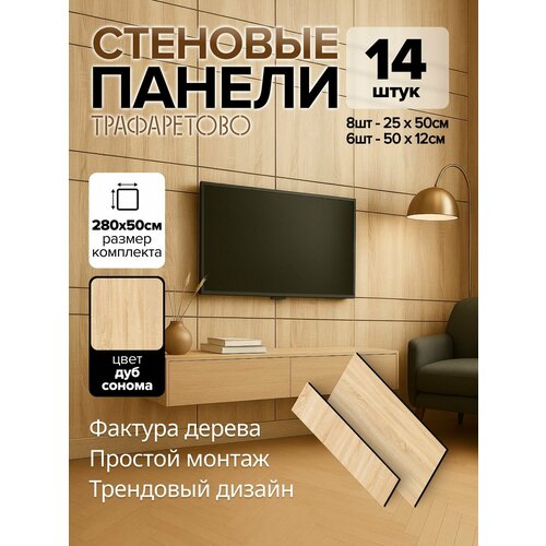 Стеновые панели в цвете "дуб сонома" — это стильное и простое решение для обновления интерьера. В комплекте 14 панелей (8 шт. 25×50 см и 6 шт. 50×12 см), суммарный размер покрытия — 280×50 см. Установка производится с помощью усиленного двухстороннего скотча — быстро, чисто и без инструментов.