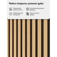 С нашими стеновыми реечными панелями можно легко улучшить внешний вид помещения, добавив в него стиль и неповторимость. Декоративные панели сочетают в себе элегантность и функциональность, а также изготавливаются из натуральных материалов. Качественные материалы и подобранные размеры: Каждая панель состоит из прочной ХДФ подложки , окрашенной в матовый черный цвет. Размеры подложки 500x680 мм с толщиной 3 мм. На подложку закреплены 10 реек, выполненных из МДФ толщиной 12 мм, покрытых шпоном. В совокупности это обеспечивают стабильность размеров, длительный срок службы панелей, и делает их подходящими для разнообразных интерьеров. Естественная красота дереваПокрытые натуральным шпоном дуба рейки неотличимы от полностью деревянных реек. А сама структура дуба добавляет вашим стенам природную теплоту и уникальный характер, делая их центром внимания. Простая установкаУстановка наших панелей проще простого. Их можно легко закрепить на стене при помощи монтажного клея – никаких сложных инструментов и навыков не требуется. А с использованием промежуточной обрешетки вы сможете выровнять даже неровную или черновую стену. Звук и экологичностьНаши реечные панели также способствуют улучшению акустического комфорта в помещении, создавая более тихую и спокойную обстановку. А применение современных, натуральных материалов и водных лакокрасочных покрытий делает панели безопасными для здоровья. Простой УходПанели легко чистятся и поддерживаются в отличном состоянии, что делает их подходящими для любых домашних или офисных условий. Практичные КомплектыМы предлагаем практичные комплекты, включающие 4 панели, которые подходят для проектов различного масштаба. Выберите наши стеновые реечные панели, чтобы создать уникальное пространство, отражающее вашу индивидуальность и уют вашего дома!