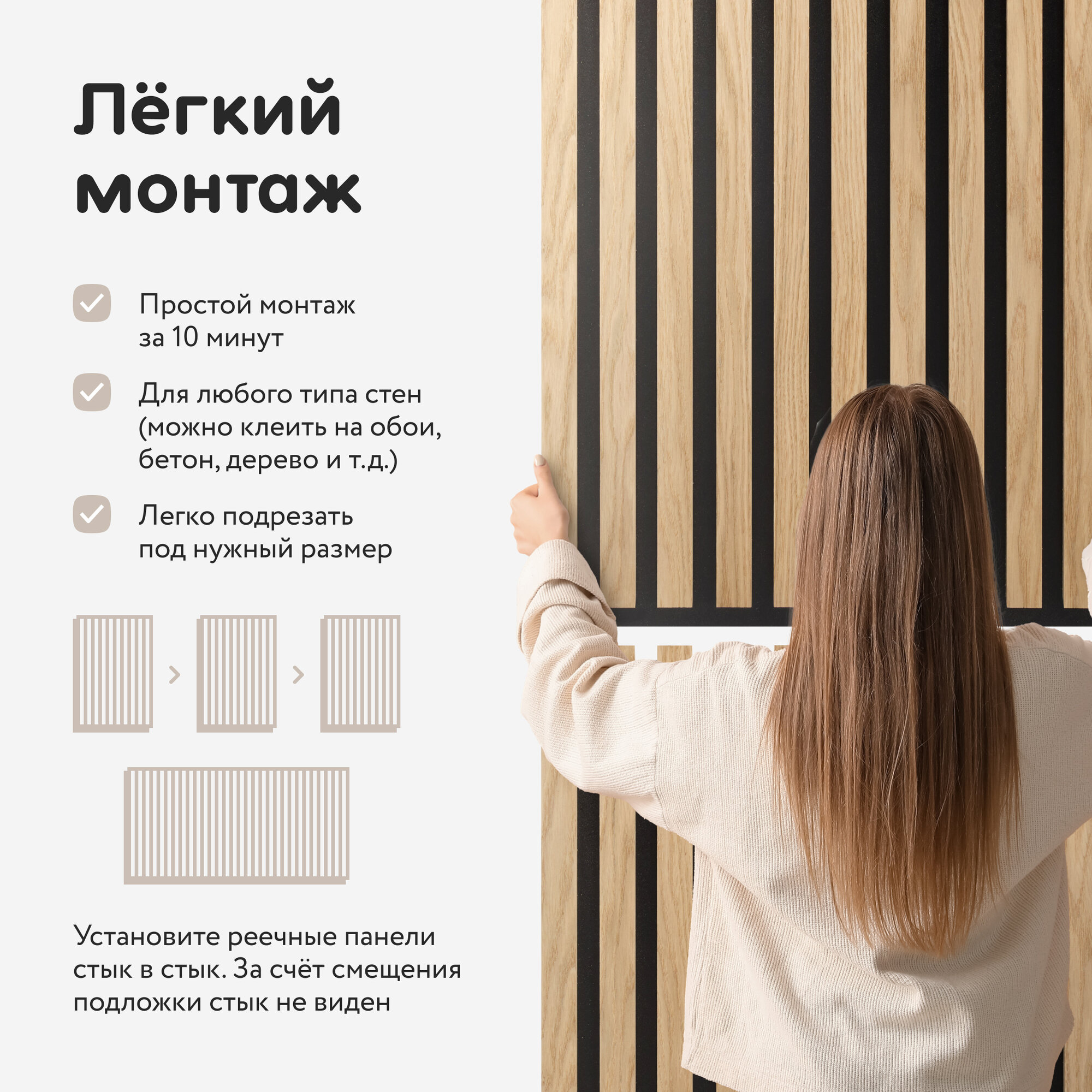 Сделаны из экологичного материала от профессиональных мебельщиков. Имеют идеально ровную геометрию. Обеспечивают дополнительную шумоизоляция и акустический комфорт в жилых помещениях. Размер комплекта 2710 х 510 мм. На панелях реализована удобная система стыковки без выравнивания, так что каждая следующая панель ровно накладывается на предыдущую и перекрывает зазор.