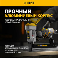 Пневматический степлер Denzel PS8016 57400 предназначен для крепления к основанию листовых материалов при помощи прямоугольных скоб 21GA размером 6-16 мм. Подходит для закрепления фанеры, оргалита, ДСП, обивочной ткани. Незаменим во время отделочных работ и производства мебели.
