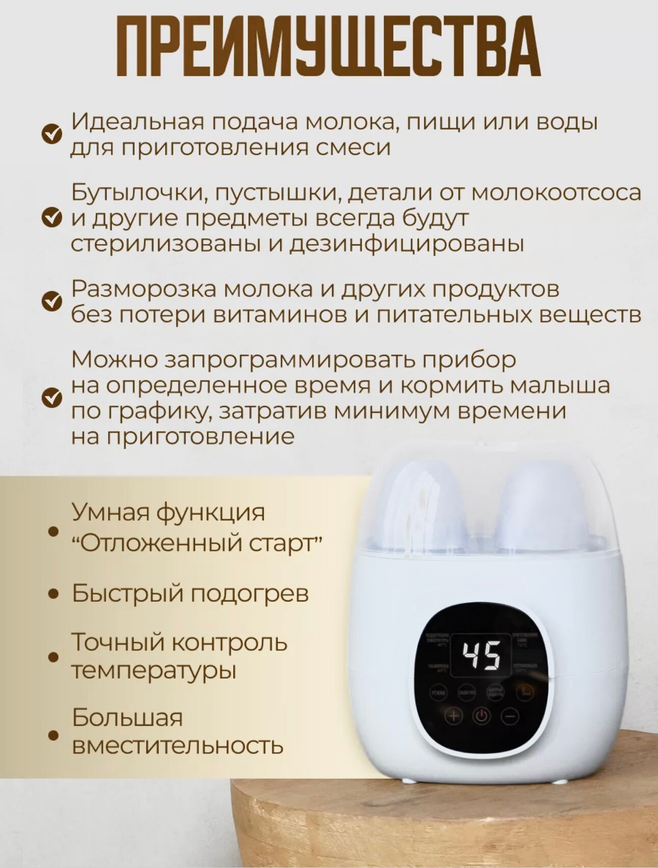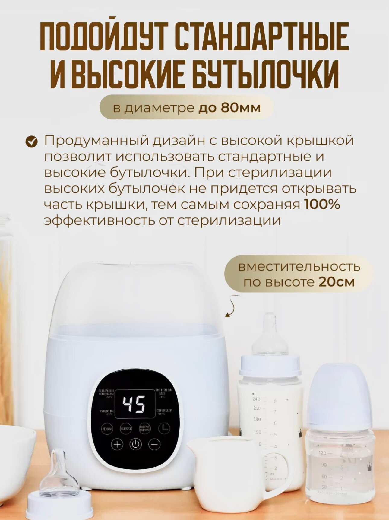 автоматическая стерилизация, автоматическое отключение, дисплей, для всех типов бутылочек, контроль уровня воды, с таймером