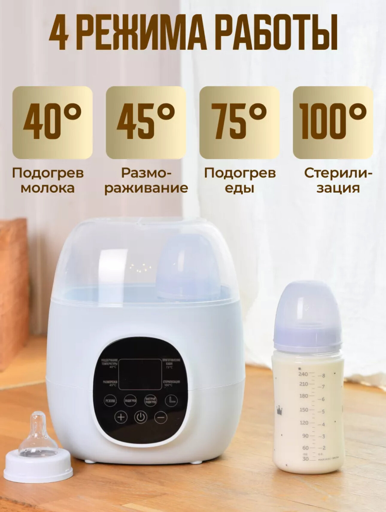 Подогреватель позволяет поддерживать оптимальную температуру питания для вашего малыша, что способствует правильному и комфортному пищеварению. Это особенно важно в холодное время года, когда ребенок может испытывать трудности с перевариванием пищи из-за снижения температуры окружающей среды.