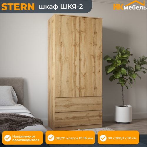 Основные характеристики: Производитель: НК Мебель Гарантия: 2 года Цветовые решения: Белый, Дуб Вотан, Дуб Сонома Размеры: 90 х 200,3 х 50 см Материал: ЛДСП класса E1, толщина 16 мм — безопасный и прочный материал Внутреннее наполнение: Левая секция: 4 полки (высота каждой — 33 см, нагрузка до 5 кг) Правая секция: штанга для одежды (высота 139 см, нагрузка до 15 кг) и нижняя полка (высота 42 см, нагрузка до 5 кг) Два выдвижных ящика (глубина 38 см, ширина 81 см, нагрузка до 7 кг каждый) Преимущества: Три стильных цвета на выбор, которые подойдут для любого дизайна интерьера Вместительные полки и штанга для удобного хранения одежды и аксессуаров Прочная конструкция, рассчитанная на ежедневное использование Простая сборка с подробной инструкцией Шкаф STERN ШКЯ-2 — отличный выбор для спальни, прихожей или детской. Организуйте свое пространство с комфортом и элегантностью!
