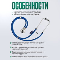 | Дополнительная информация | - двусторонняя металлическая головка с кварцевыми часами; - две утолщенная звукопроводящая трубка; - бинауральные металлические трубки; - ластиковый колокол большой (диаметр 33 мм); - пластиковый колокол малый (диаметр 26 мм); - пластиковый колокол неонатальный (диаметр 19 мм); - мембрана большая (диаметр 38 мм); - диафрагма малая; - мембрана малая (диаметр 25 мм); - два комплекта пластиковых наконечников для ушей (твердые и мягкие); - сумочка для дополнительных принадлежностей; - инструкция по эксплуатации; - гарантийный талон; |