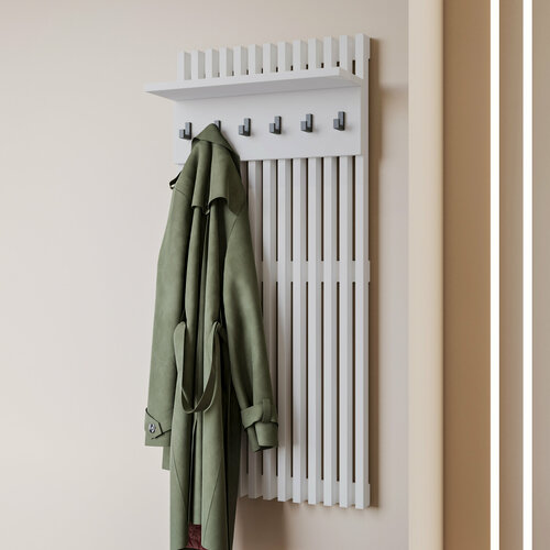Вешалка настенная с рейками "Стиль плюс" 2 предназначена для хранения верхней одежды, курток, сумок и прочих вещей. Вешалка Стиль плюс - замечательное интерьерное решение для прихожей, в коридор или в любую комнату. Модный дизайн, с использованием реек, несомненно украсит вашу квартиру, станет стильным элементом дизайна любого пространства, а полка послужит дополнительным местом хранения вещей и аксессуаров. Вешалка Стиль плюс прекрасно подойдет под классический стиль, стиль лофт или современный минимализм. Модные крючки черного цвета со скрытым креплением выдерживают нагрузку до 10 кг на один крючок. Вешалка комплектуется 6 крючками со скрытым креплением. Вешалка изготовлена из ЛДСП, белого цвета, который является одним из самых популярных цветов для мебели, также он практичный и универсальный, подойдет для интерьера в любой цветовой гамме. Вешалка Стиль плюс предназначена не только для дома и офиса, но также подойдет и для дачи. Вешалка Стиль плюс надежна, удобна и проста в сборке и монтаже, сборка займет не более 15 минут! Красивая, стильная, модная вешалка Стиль плюс украсит любой интерьер. Поставляется в разобранном виде. Возможность скрытого крепления к стене.