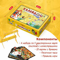 | Комплектация | В состав настольной игры Калейдос входят: 4 набора по 5 двусторонних карт с иллюстрациями, песочные часы, 23 карты с буквами, 4 мольберта, правила игры. |