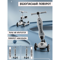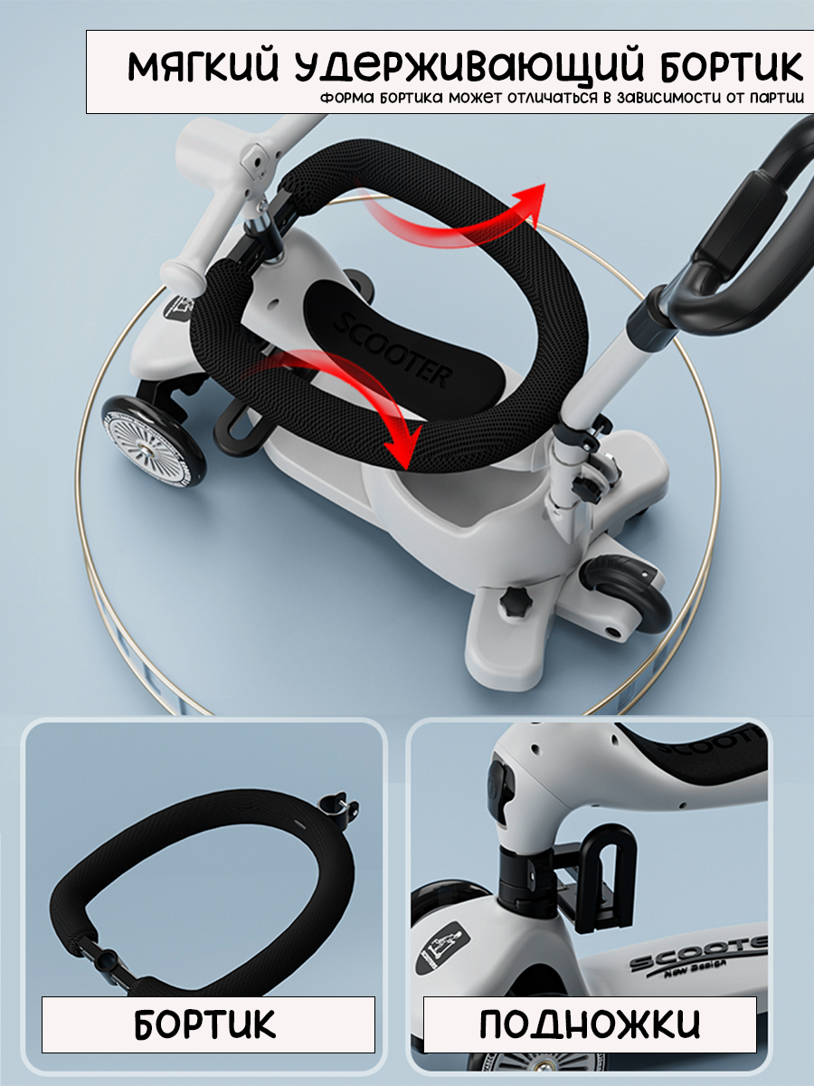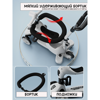 По мере роста ребёнка можно: снять бортик-ограждение, убрать подставку, убрать ручку-толкатель, убрать дополнительные колёса, поднять сидение, превратить беговел в самокат, поднять руль. Сдвоенные передние колёса позволяют иметь три точки опоры в режиме самоката, что придаёт дополнительную устойчивость и безопасность. Подходит как для девочек так и для мальчиков.
