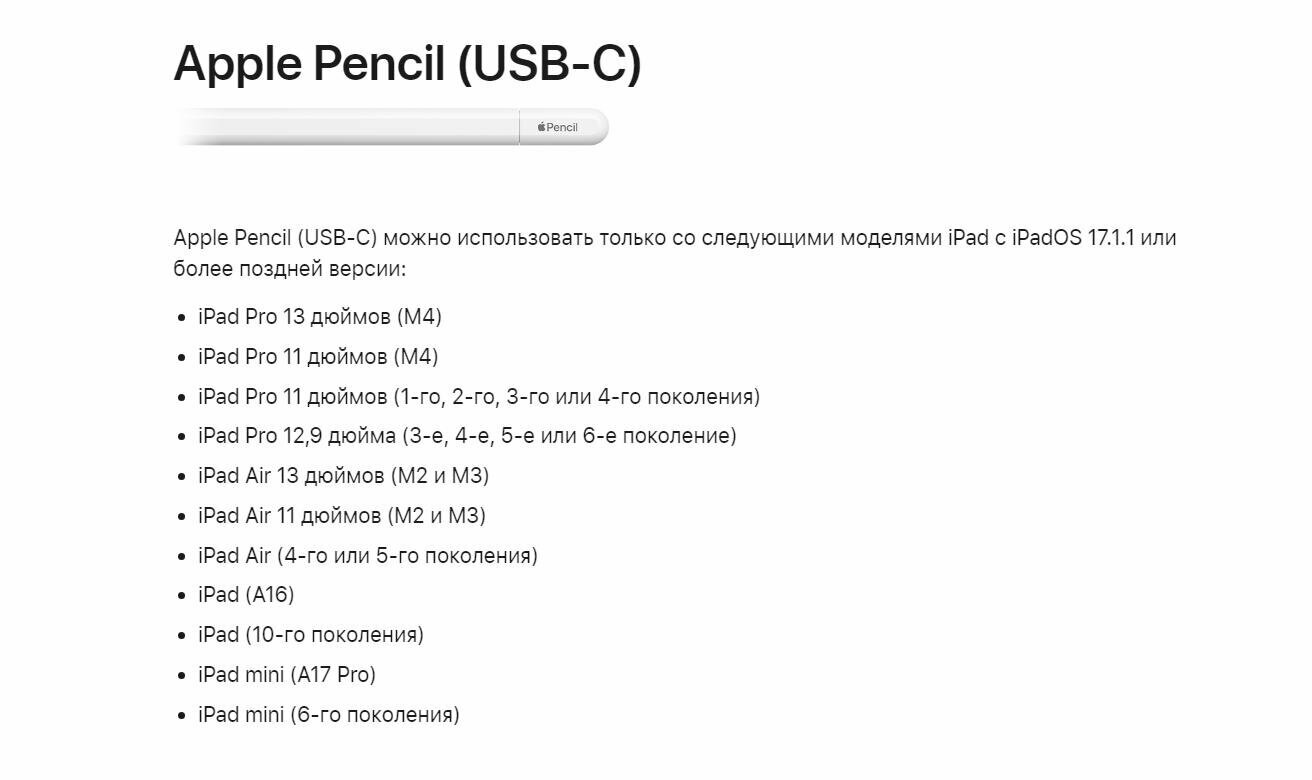 Apple Pencil (USB-C) поддерживает наведение Apple Pencil при использовании с iPad Pro 12,9 дюйма (6-го поколения) и iPad Pro 11 дюймов (4-го поколения).