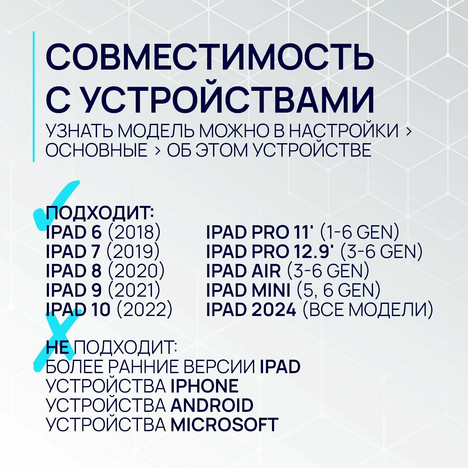 ВНИМАНИЕ Перед оформлением заказа, пожалуйста, убедитесь, что стилус совместим с Вашим iPad. Стилус для планшетов Apple iPad работает с планшетами Apple iPad 2018, 2019, 2020, 2021, 2022 , 2023 ,2024 годов. Поколение Вашего планшета можно узнать, перейдя на iPad в Настройки - Основные - Об этом устройстве - Название модели. Стилус для iPad не совместим с телефонами IPhone. НЕ ПОДХОДИТ ДЛЯ iPad 2017 2016 2015.