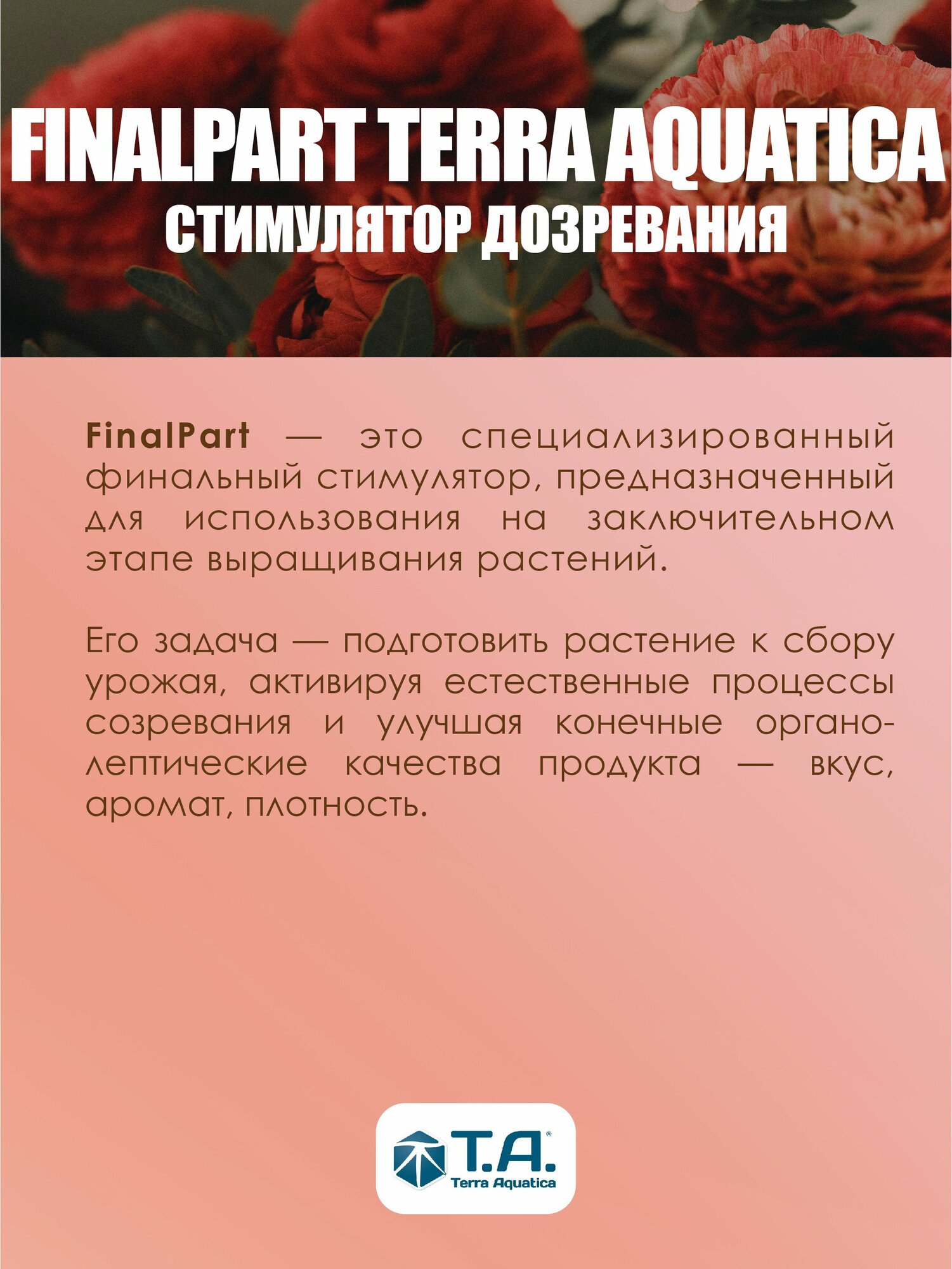 Подобный компонент известен в промышленности как 'forcing solution' Ripen -соединение отчищенных минеральных солей и буферов, созданное в наших лабораториях с высокой точностью. На конечном этапе жизни растения, именно точность в подборке компонентов имеет важное значение: растение в этой стадии является очень хрупкой биологической системой с пониженной ассимиляцией.
