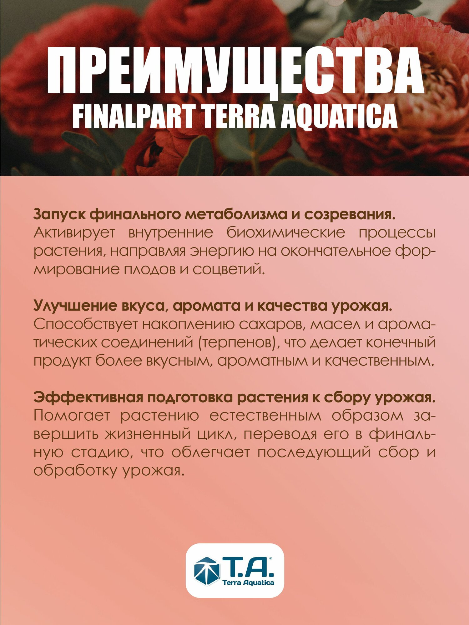 - Подает растению сигнал о завершении его жизненного цикла, что стимулирует процесс созревания аккумулируя все жизненные силы на этом этапе.