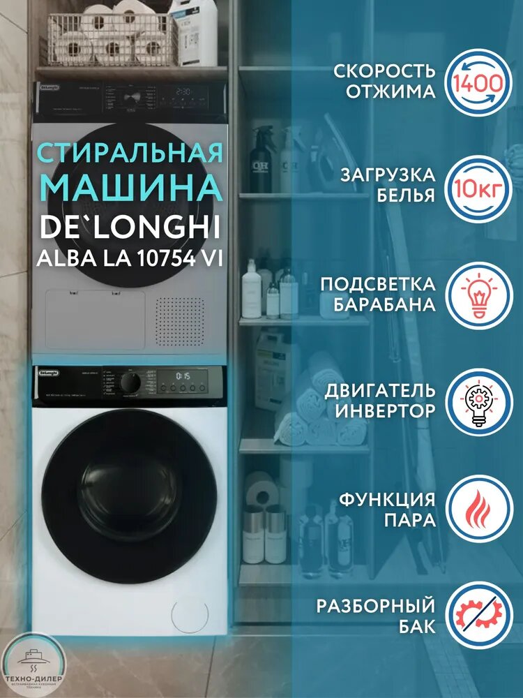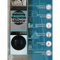 Стиральная машина DeLonghi ALBA LA 10754 VI с загрузкой 10,5 кг, инвертором и паром — надёжная и современная техника для большой семьи. Благодаря вместительному барабану глубиной 60 см и увеличенному объёму загрузки, модель легко справляется с крупными вещами: постельным бельём, одеялами, куртками и спортивной экипировкой.