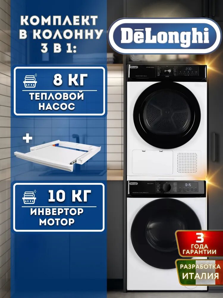 Стиральная и Сушильная машина в колонну Delonghi Делонги ALBA LA 10754 VI + DTD 8106 H EMILIA + выдвижная полка DSKS008