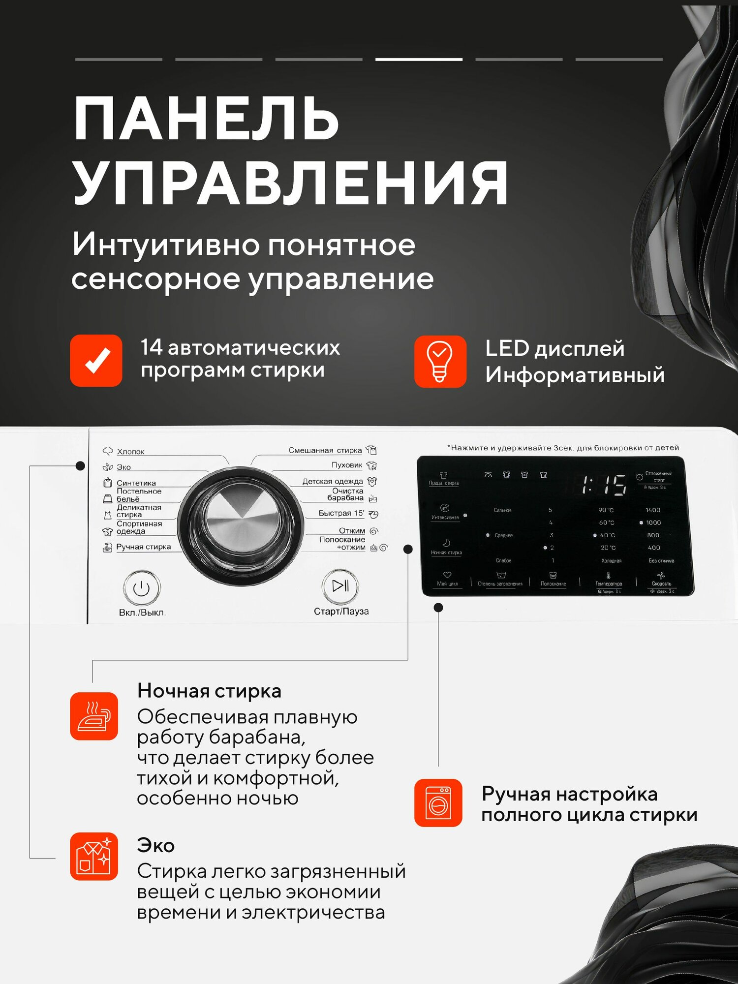 | Программы | быстрая стирка, отжим, стирка детских вещей, стирка одеяла, стирка синтетики, стирка смешанных тканей, стирка спортивной одежды, стирка хлопка, стирка шерсти, экономичная программа |
