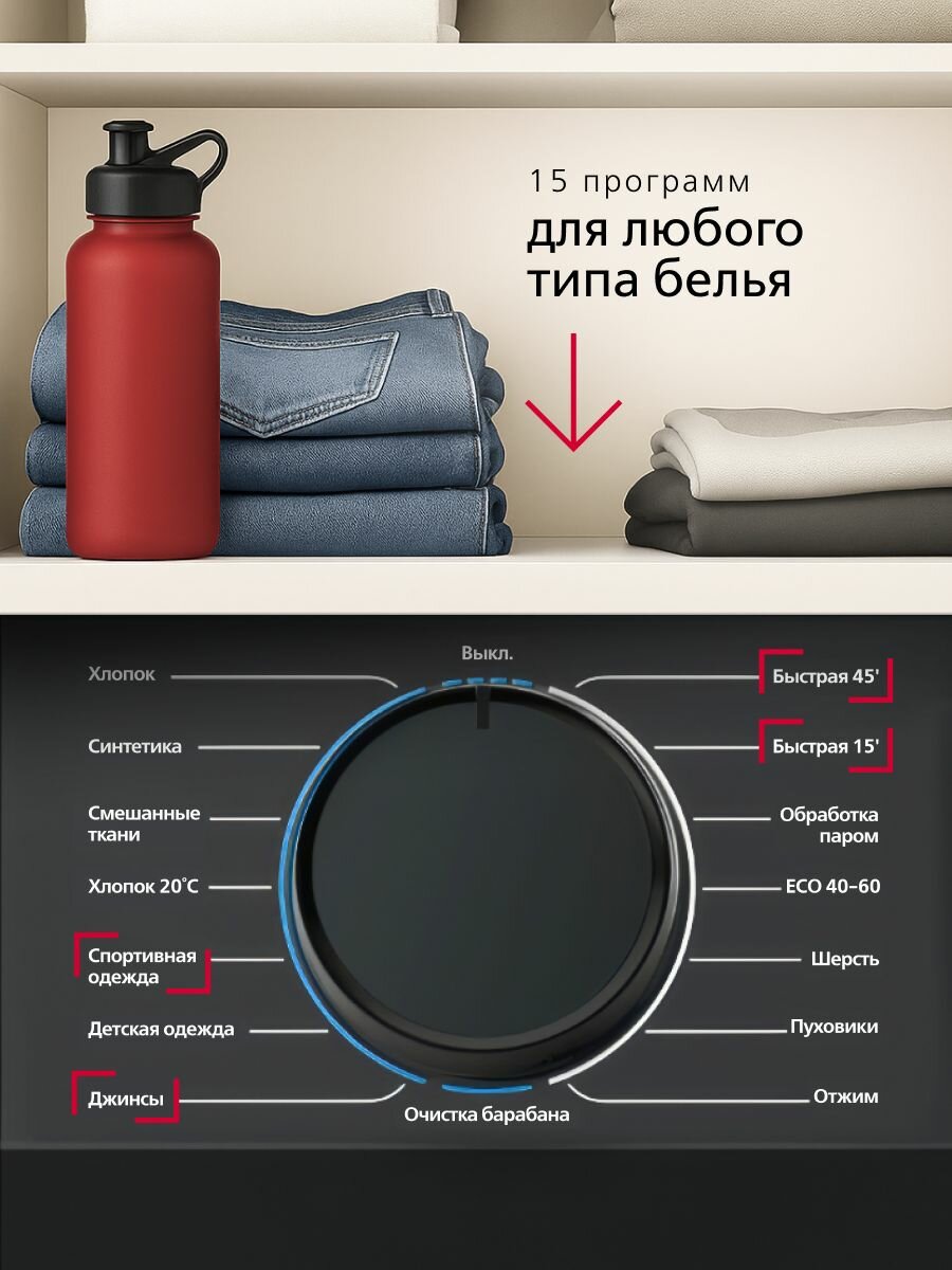 | Программы | быстрая стирка, гипоаллергенная стирка, дополнительное полоскание, отжим, предварительная стирка, ручная стирка, стирка детских вещей, стирка пуховых вещей, стирка синтетики, стирка смешанных тканей, стирка спортивной одежды, стирка хлопка, стирка черных вещей, стирка шерсти |