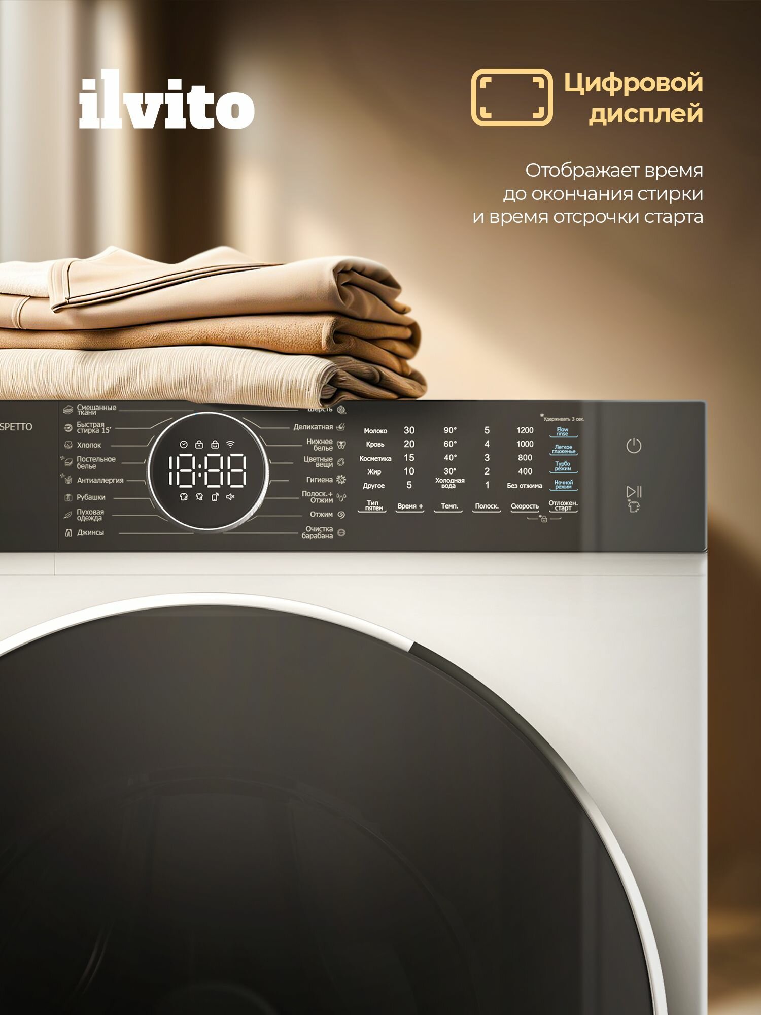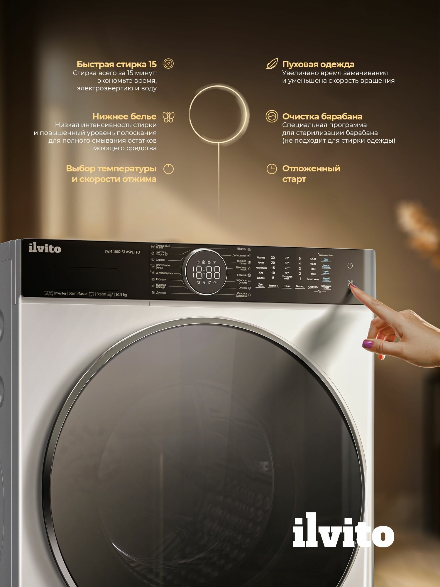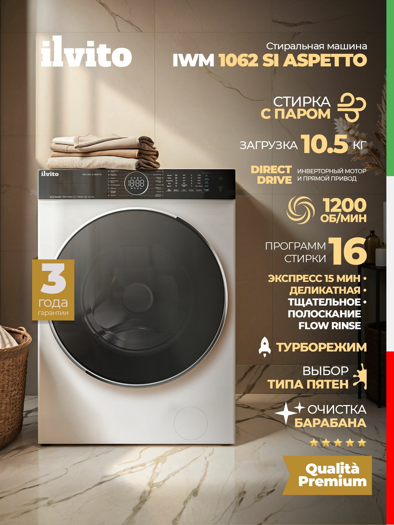 Стиральная машина автомат ILVITO IWM 1062 SI ASPETTO модель 2025 г, инвертор, 10,5 кг, 16 программ, пар, очистка барабана: сравнение цен, характеристики, фото, актуальное наличие и цены.