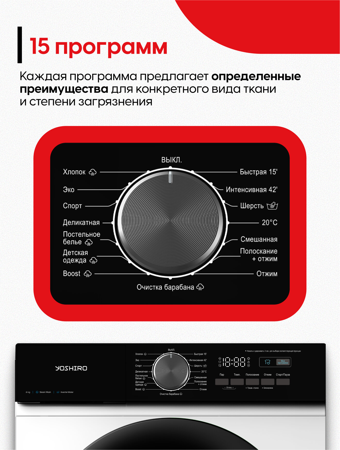 Стиральная машина автомат YOSHIRO YWM-F6B101, 15 программ, сенсорное управление, фронтальная загрузка