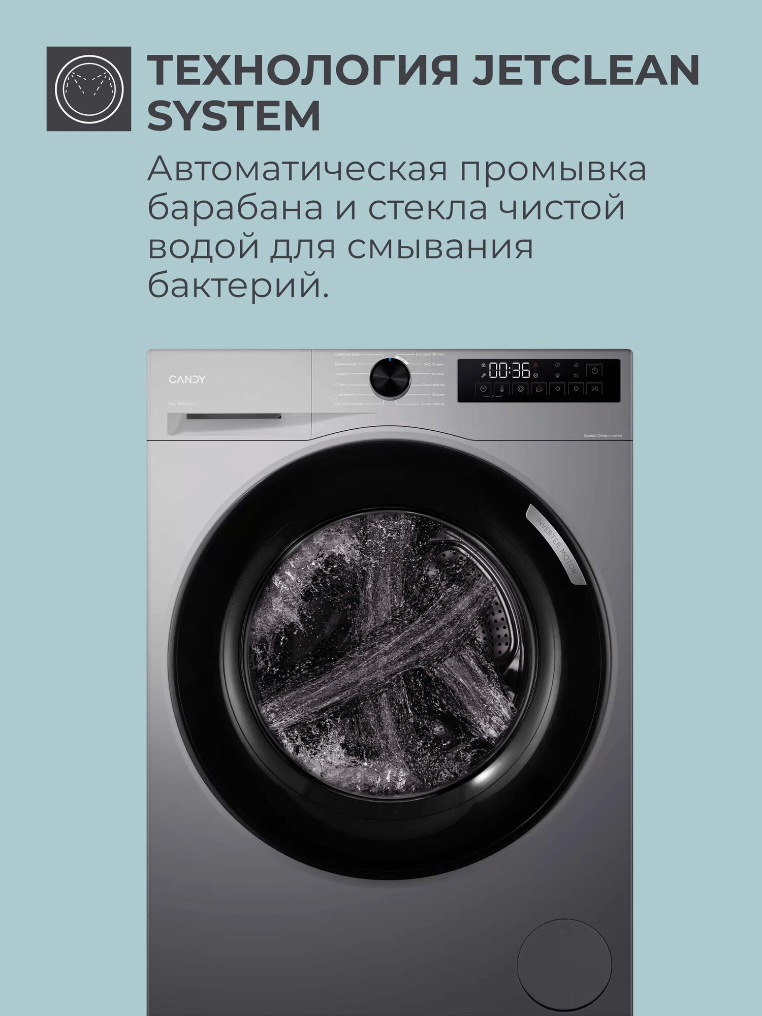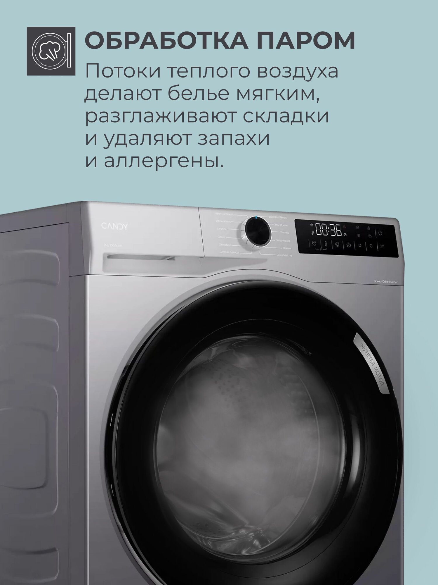 выбор скорости отжима, выбор температуры стирки, контроль баланса, контроль за уровнем пены, отложенный старт, очистка барабана, сигнал окончания стирки